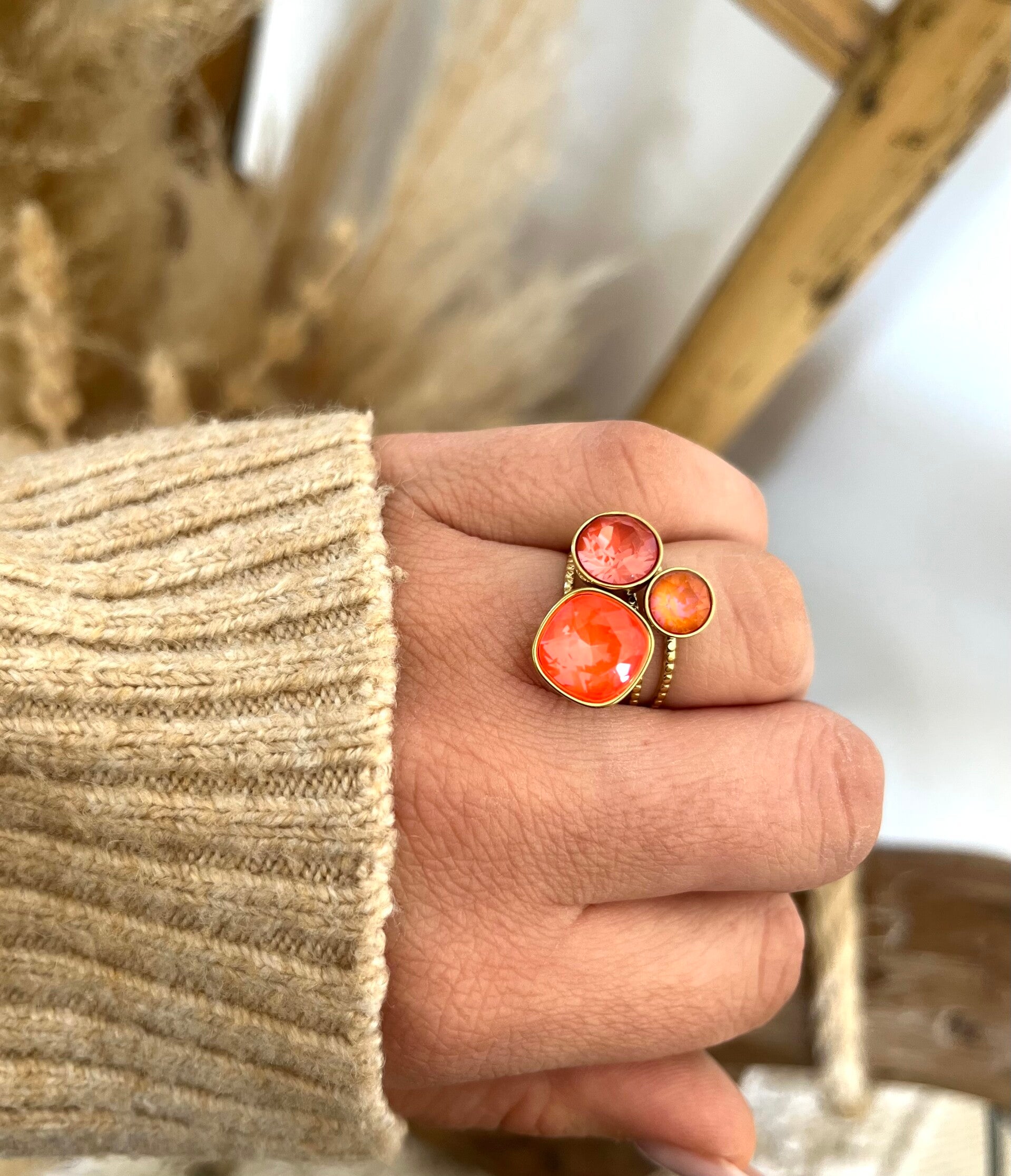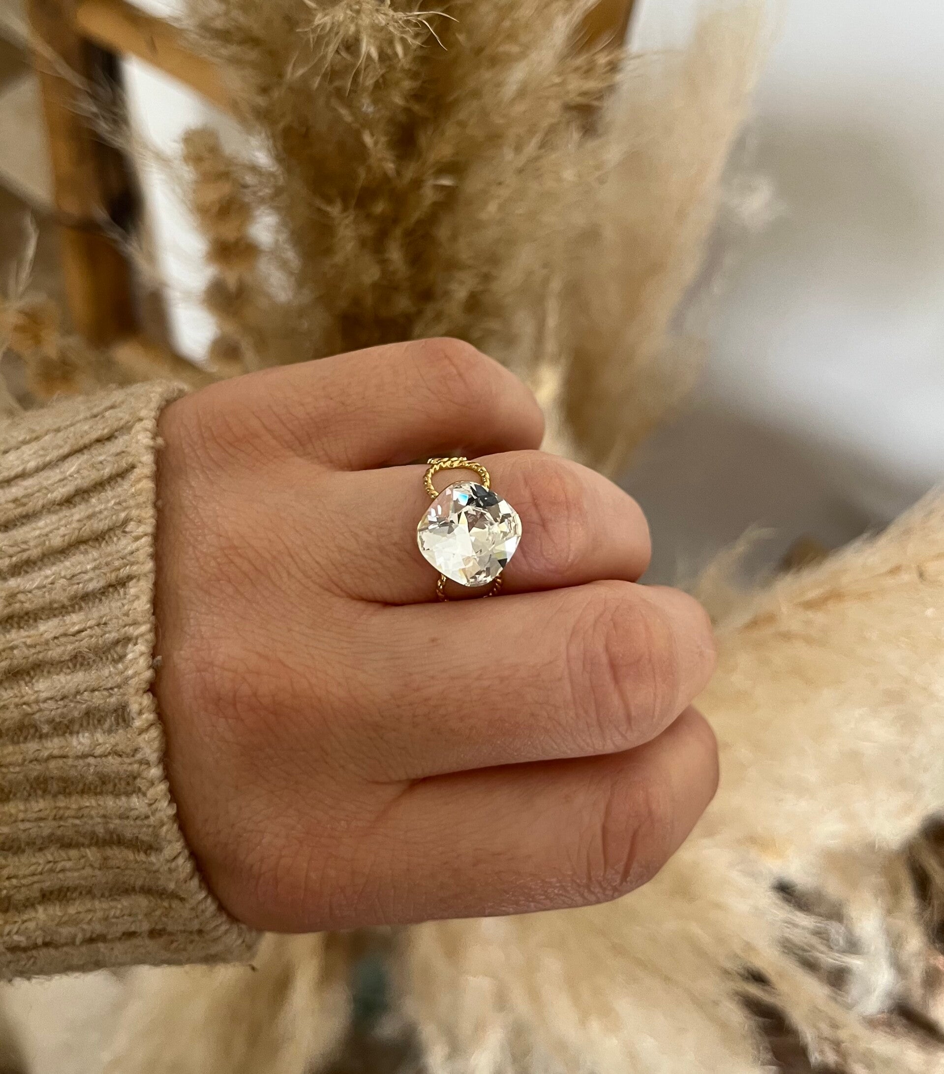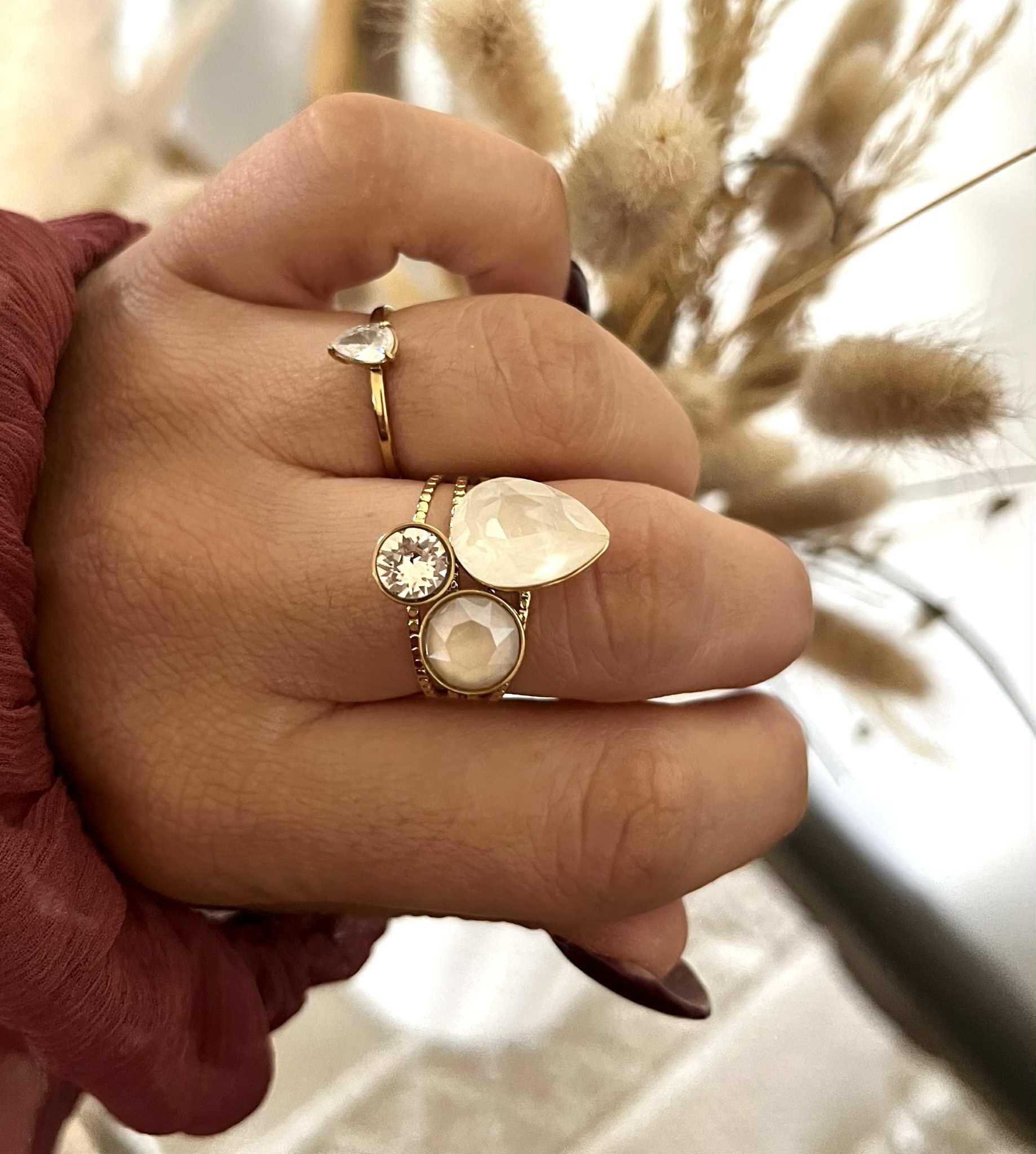 Sa monture dorée délicatement travaillée apporte une touche chic et intemporelle, tandis que la taille facettée du cristal capte la lumière à chaque mouvement.