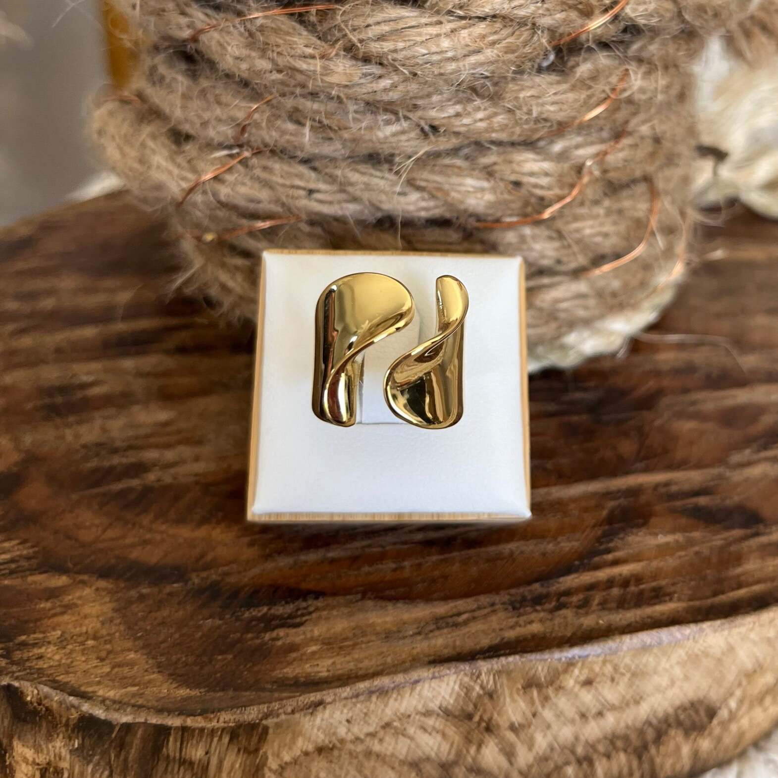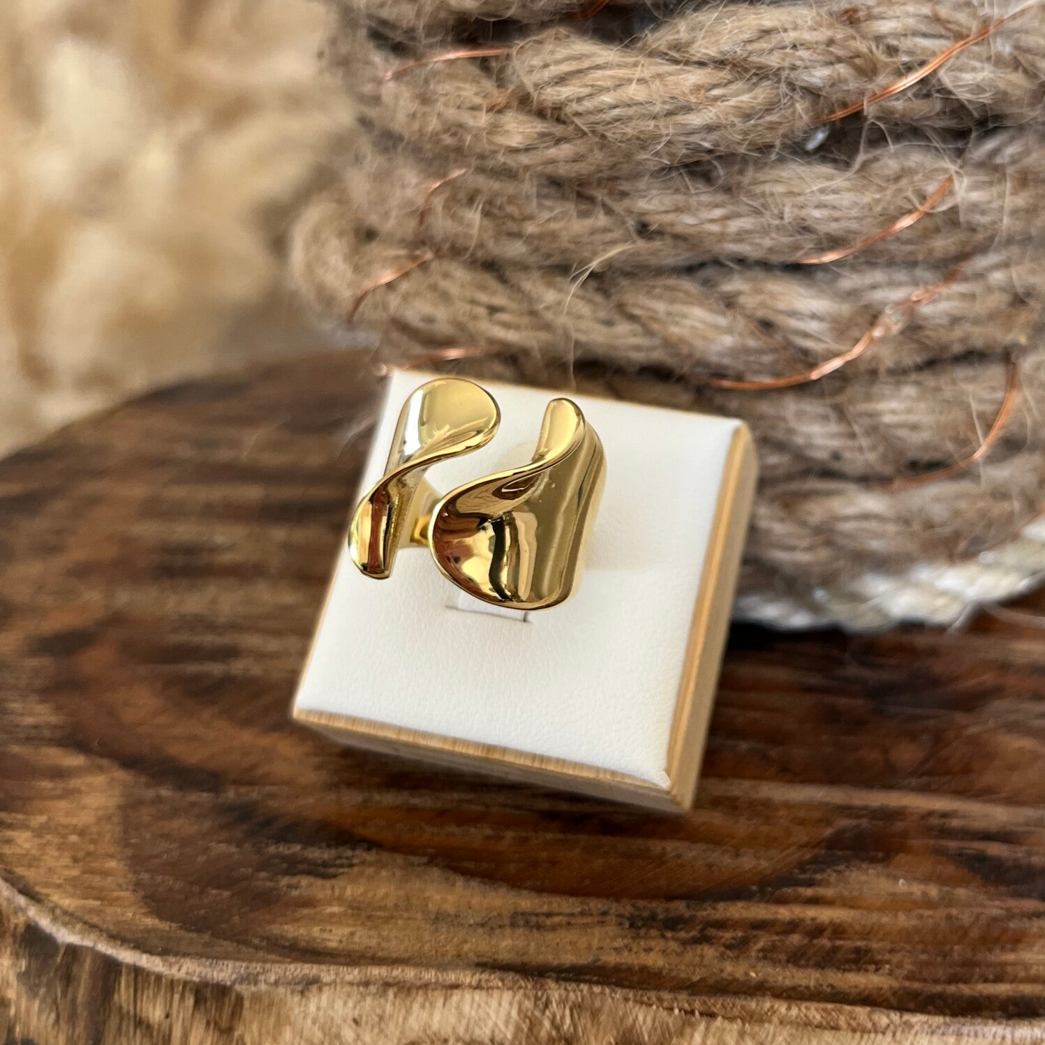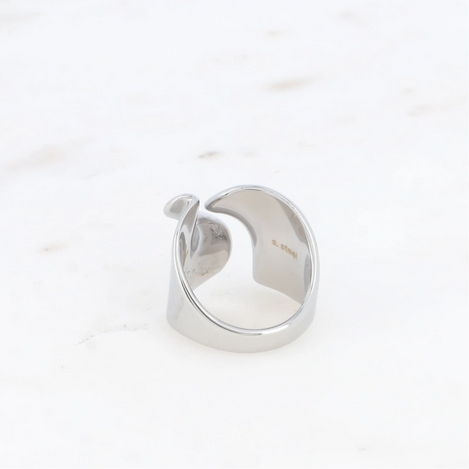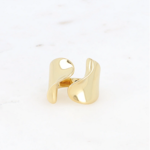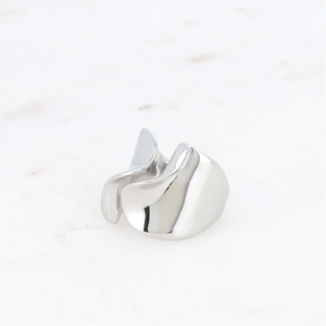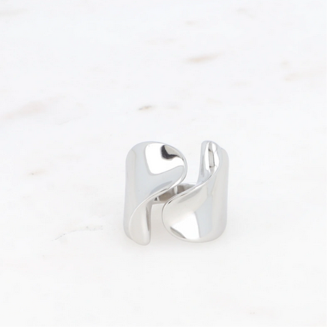 - Bague large et ouverte en acier inoxydable composée d'une ouverture ondulée.