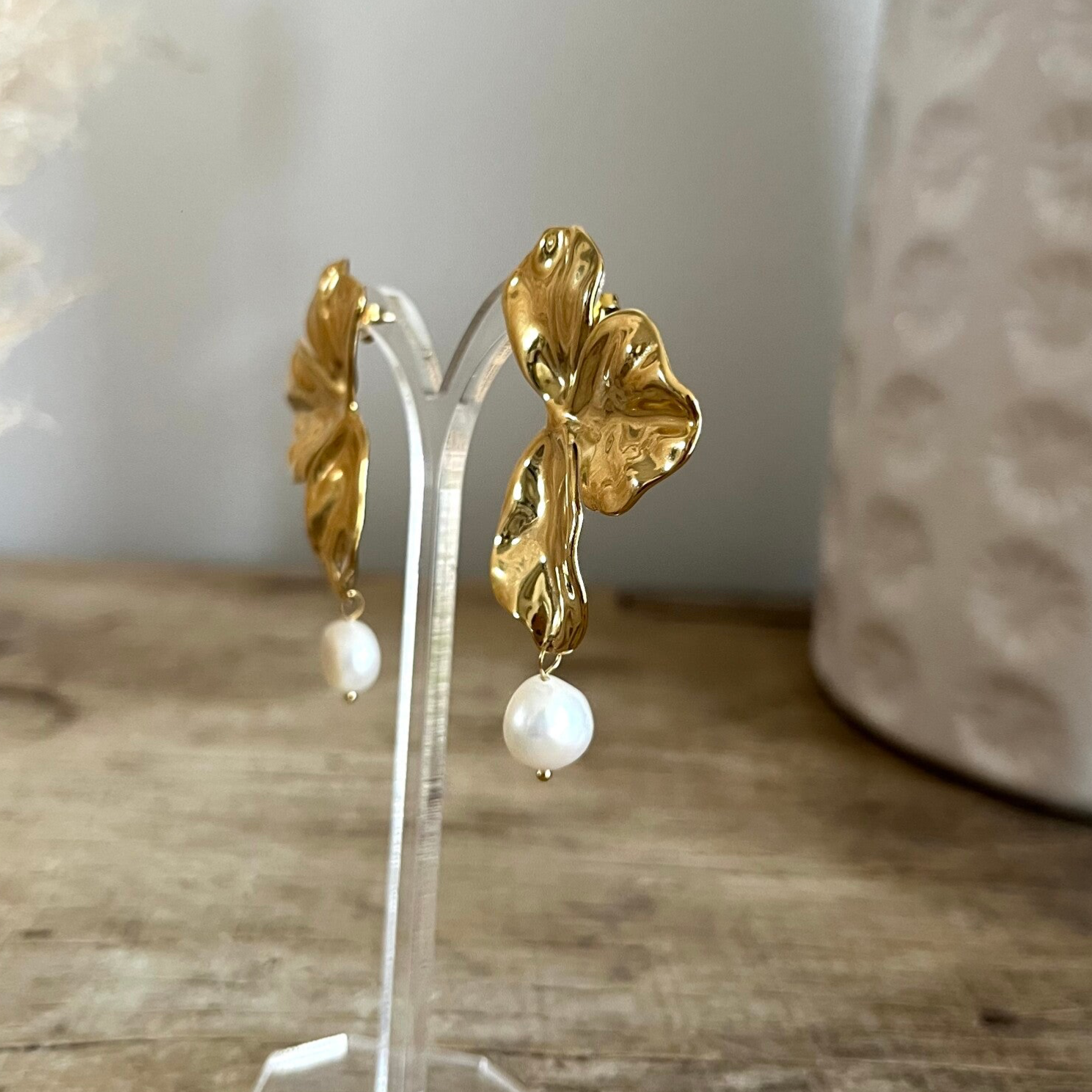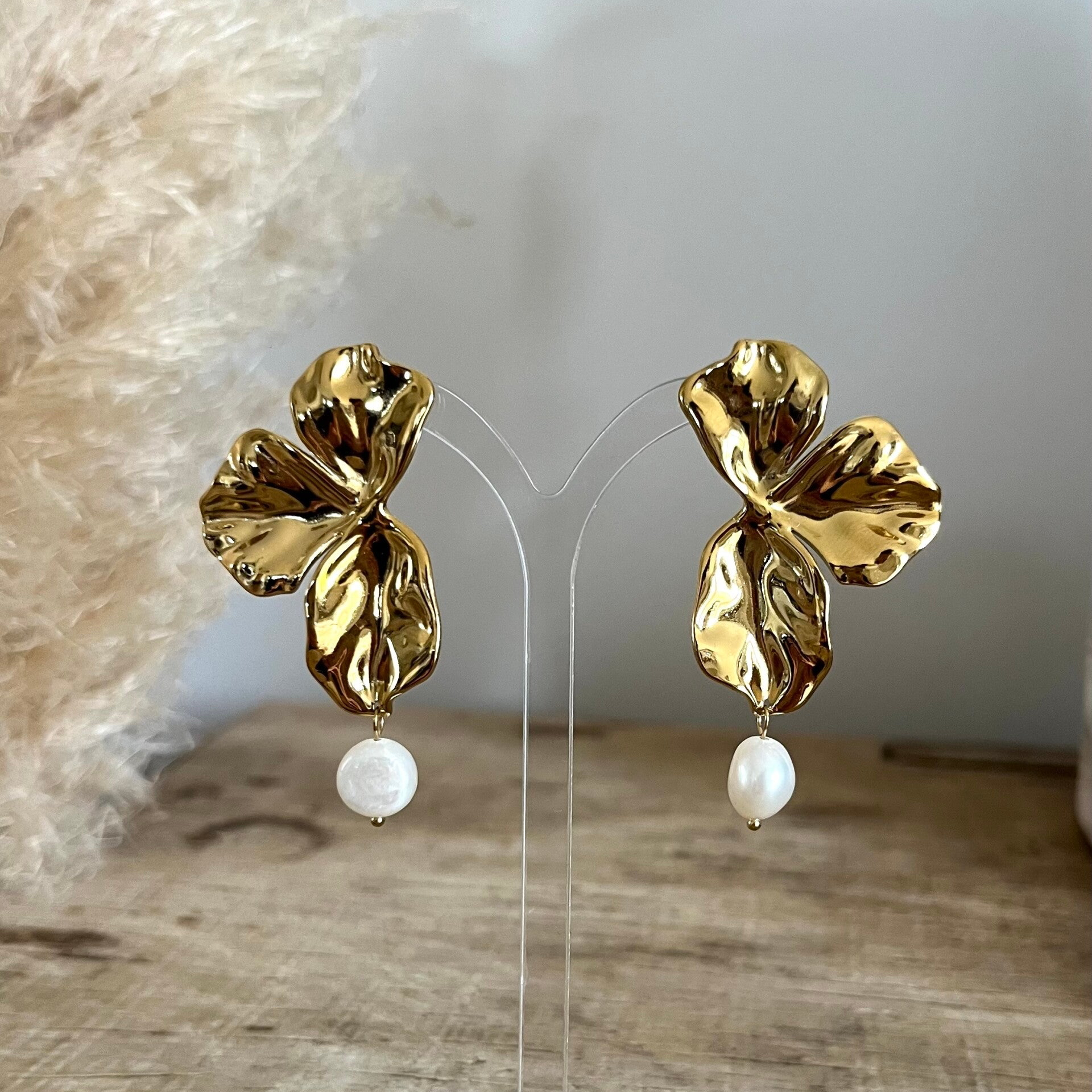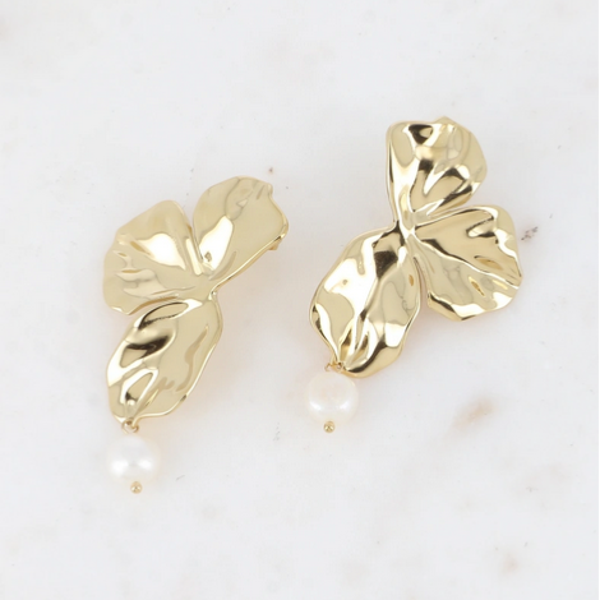 - Boucles d'oreilles puces en acier inoxydable composées d'un motif floral, 3 pétales ondulées avec une perle d'eau douce pendante.