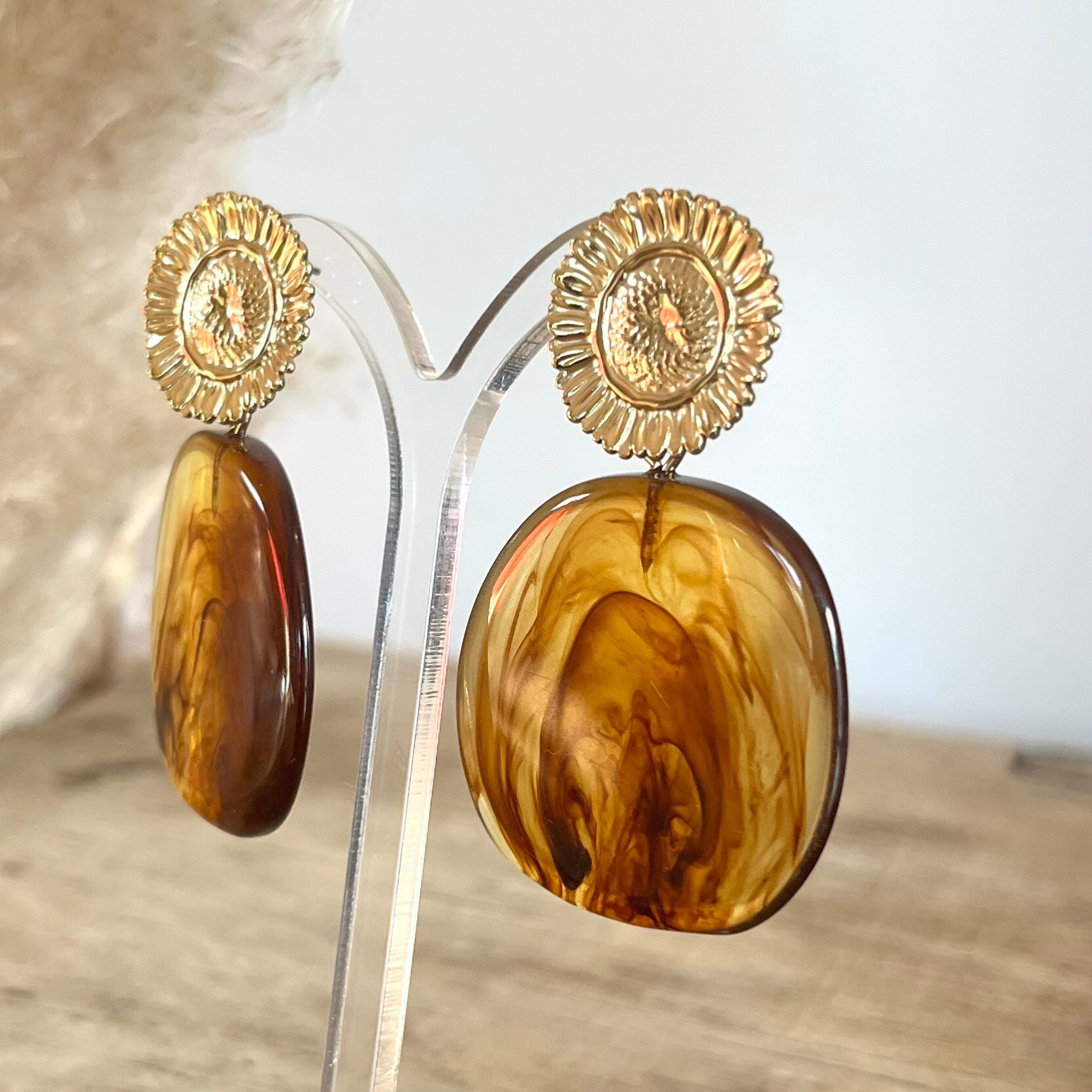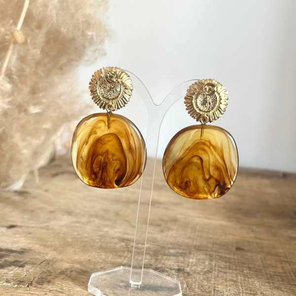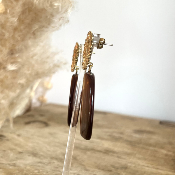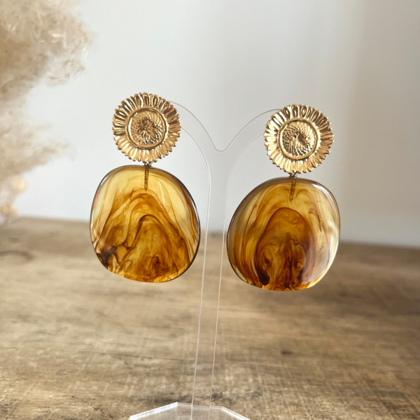 - Boucles pendantes avec motif floral aux petales texturées et piece en acétate