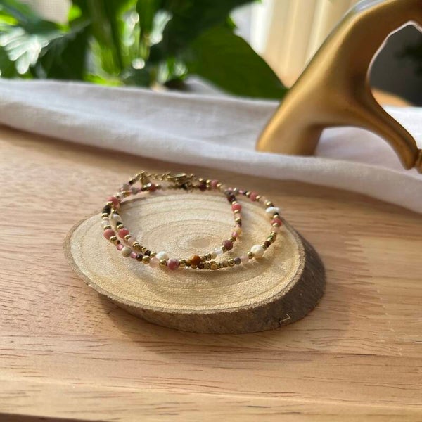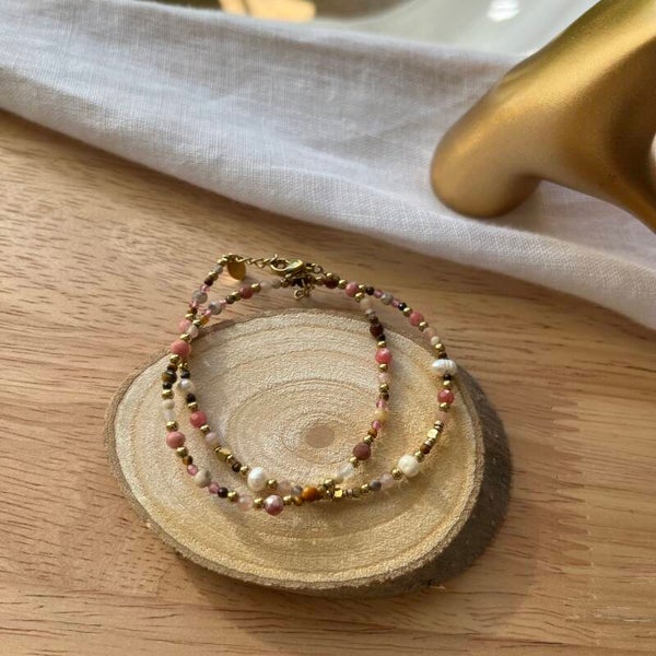 - Bracelet double tour orné de perles en acier inoxydable, de pâtes de verre, perles d'eau douce et de pierres naturelles.