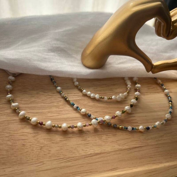 - Collier sur câble type ras de cou orné de perles, de pierres naturelles (tourmaline) et de perles d'eau douce.