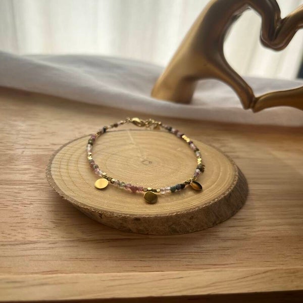- Bracelet sur fil composé de pierres naturelles (Tourmaline), de perles en acier inoxydable et de pastilles rondes aux étoiles gravées.