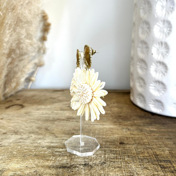 Composées d'une pièce en acier inoxydable et d'une fleur pendante en raphia synthétique.