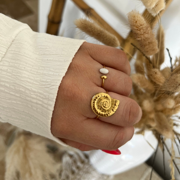 - Bague fine en acier inoxydable composée d'un anneau et d'un motif coquillage escargot texturé.