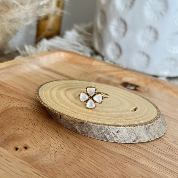 - Bague fine en acier inoxydable composée d'un motif trèfle à 4 feuilles en pierre naturelle.