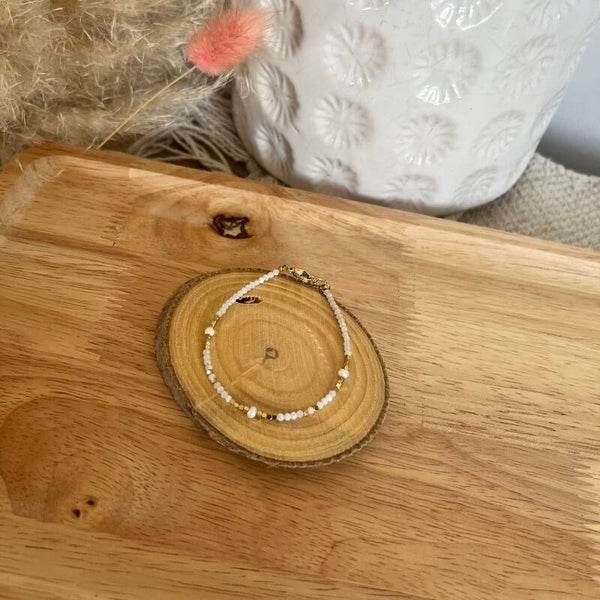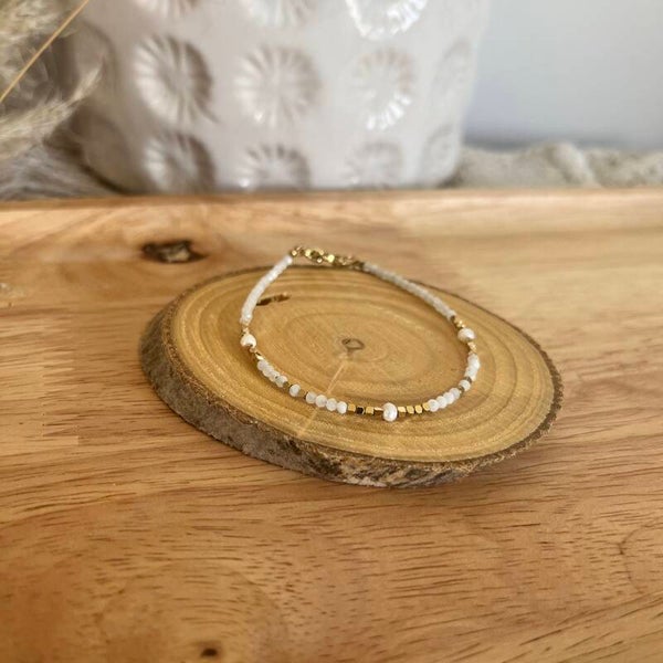 - Bracelet sur fil orné de pierres naturelles (Agathe blanche), de perles d'eau douce et de perles en acier inoxydable.