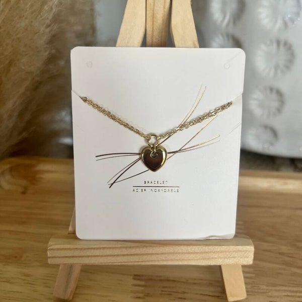 - Composé de deux chaînes qui se relient à un anneau sur lequel est accroché un pendentif coeur.