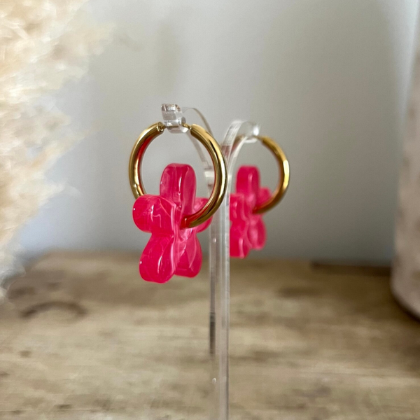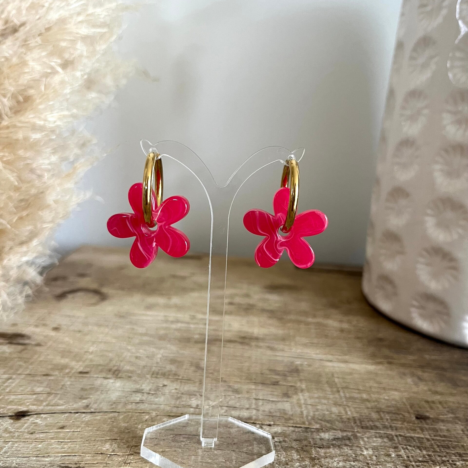 - Boucles d'oreilles type créoles avec fermoir à charnière en acier inoxydable composées d'un anneau simple ainsi que d'une pièce en forme de fleur en acétate coloré fushia.