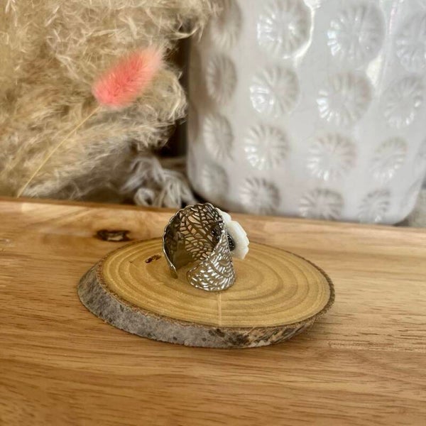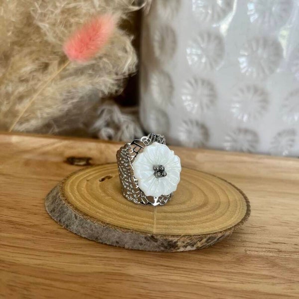 - composée d'un anneau avec un motif feuillage ajouré et d'une pièce en forme de fleur en nacre blanche.