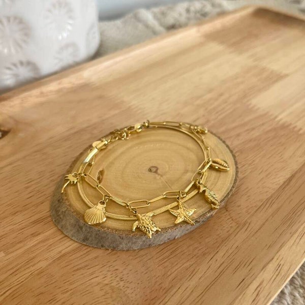 - composé de 2 mailles, l'une miroir et l'autre en maille ovale ornée de 7 pampilles marins (coquillages, étoile de mer, tortue, palmier et hippocampe).