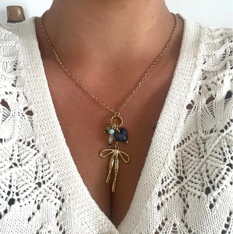 - composé d'un anneau torsadé et de diverses breloques (noeud papillon, coeur et pierres naturelles)
