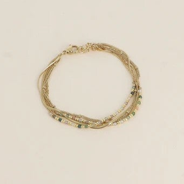 - Bracelet multi rangs en acier inoxydable composé de 5 chaînes dont 2 mailles miroir, 2 mailles forçat avec des pierres naturelles (agathe indienne) et une chaîne torsadée avec des boules perlées.