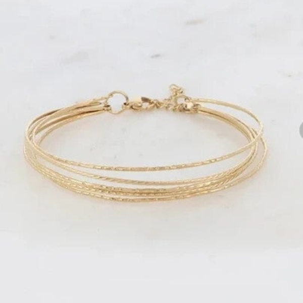 - Bracelet type jonc semainier en acier inoxydable composé de 5 anneaux aux nervures droites et dentelées.