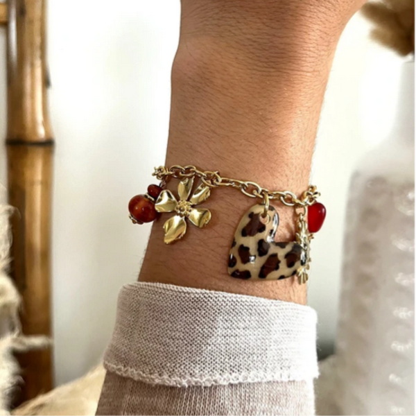 - Bracelet sur chaîne en acier inoxydable composé de divers pendentifs (perles en céramique, coeurs en résine, soleil et fleur).