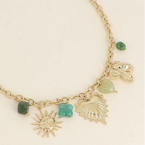 - Collier sur chaîne en acier inoxydable composé de breloques (soleil, coeur, résine et pierres naturelles).