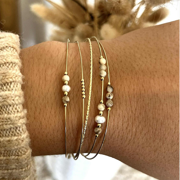 - Composé de 5 anneaux aux nervures dentelées, serti de pierres naturelles (jaspe paysage) et de perles