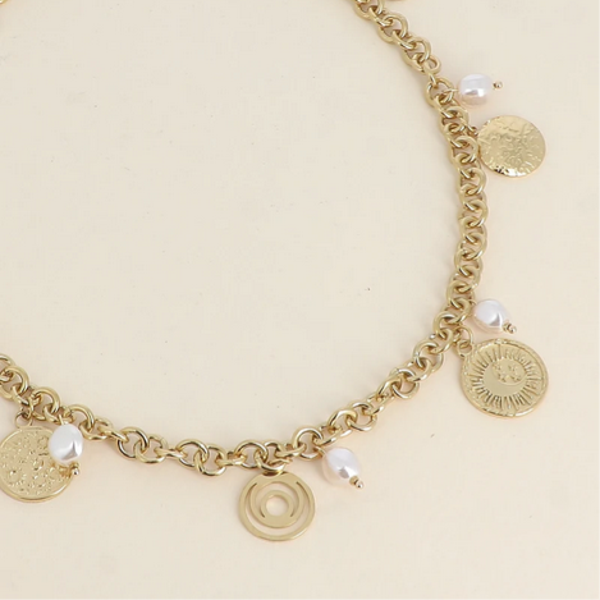 - Collier sur chaîne en acier inoxydable composé d'une maille jaseron épaisse, embellie par des breloques diverses (perles de résine blanche et pampilles rondes aux motifs de ciel étoilé, soleil et lune).