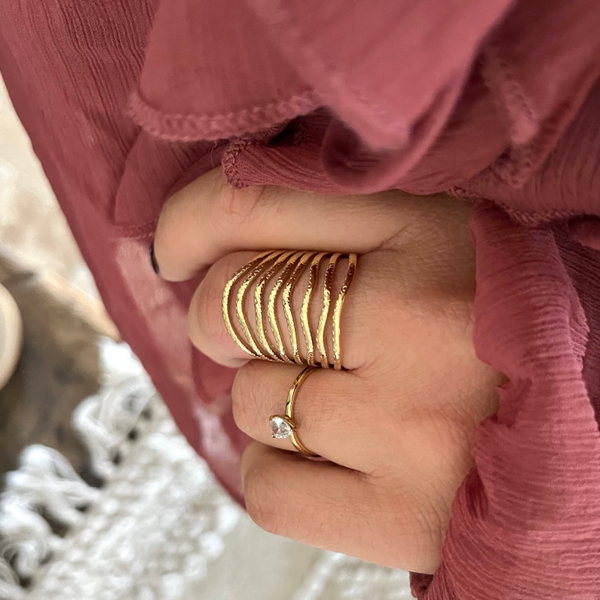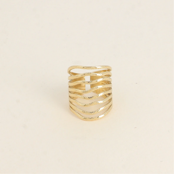 - Bague large en acier inoxydable composée de 8 anneaux ondulés aux petits cercles gravés.