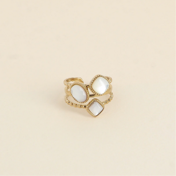 - Bague en acier inoxydable composée de 3 anneaux effet milgrain et de 3 pierres naturelles carrées et ovale.