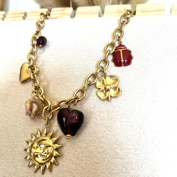 - Collier sur chaîne en acier inoxydable composé de diverses breloques (coeur, éclipse, fleur en céramique, coeur en résine, fleur).
