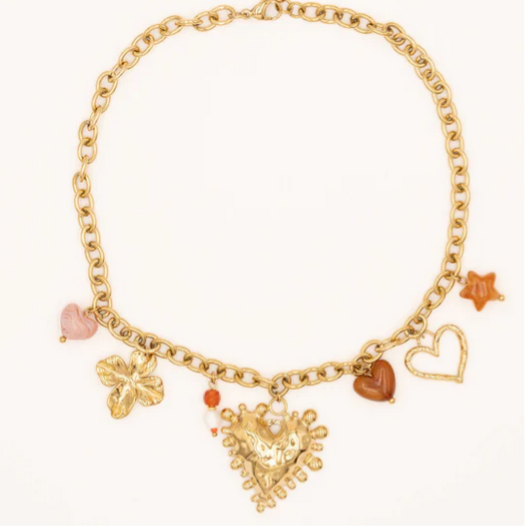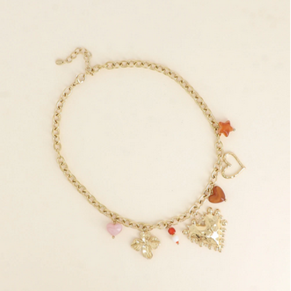 - Collier sur chaîne en acier inoxydable composé de coeurs, feuillage et étoile.