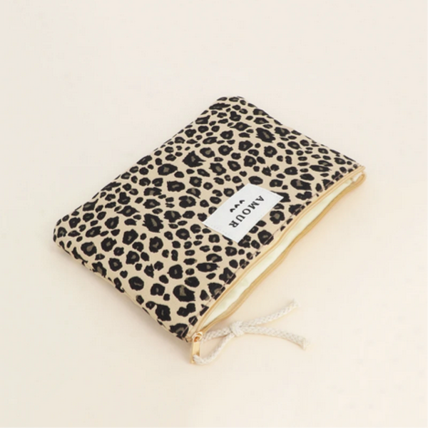 - Trousse côtelée avec de jolis motifs léopard imprimés et embelli par un mot "AMOUR" suivi de 3 coeurs.