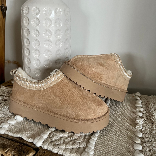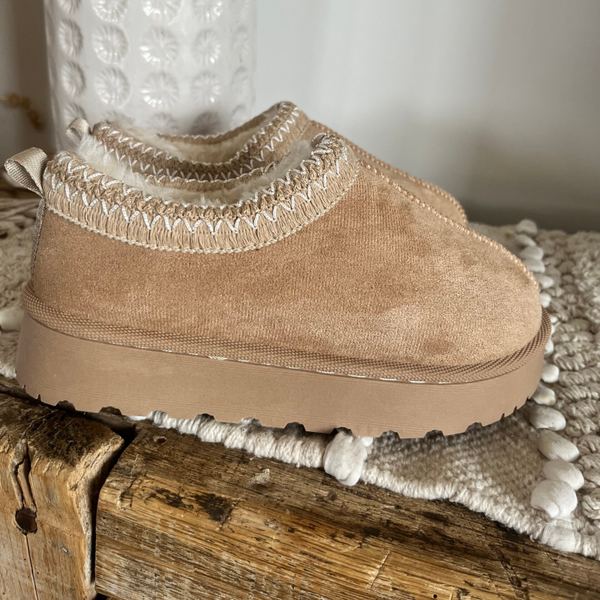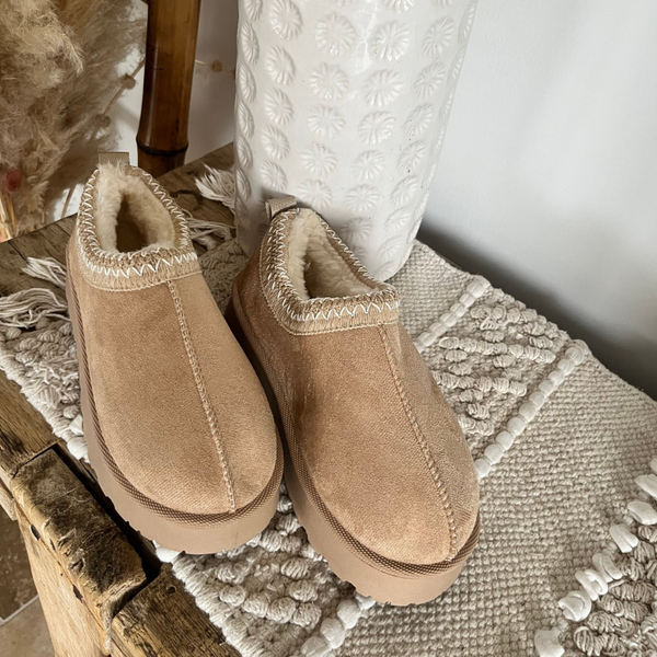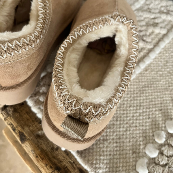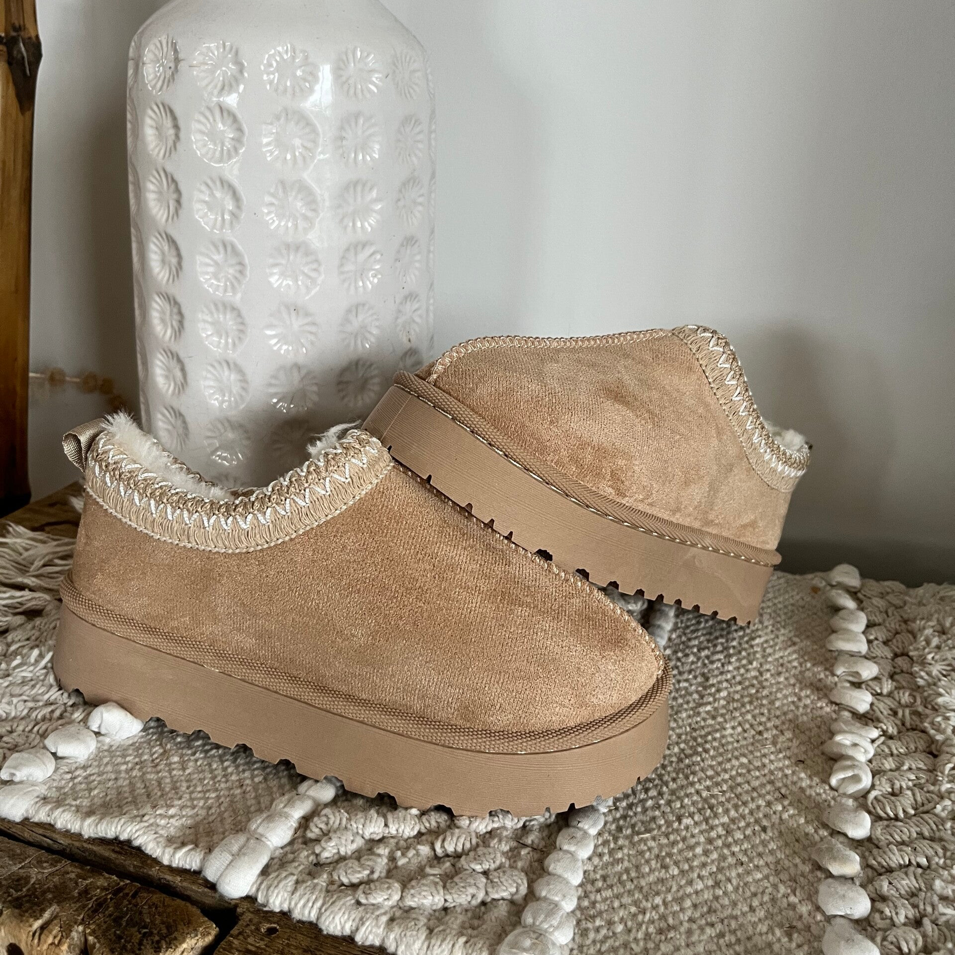 Mules en velours, ornées de coutures beige et blanc délicates. A enfiler avec aisance, l'intérieur en fausse fourrure douce enveloppe le pied de chaleur et de confort, tandis que les semelles de 4 cm offrent une allure élégante et raffinée.