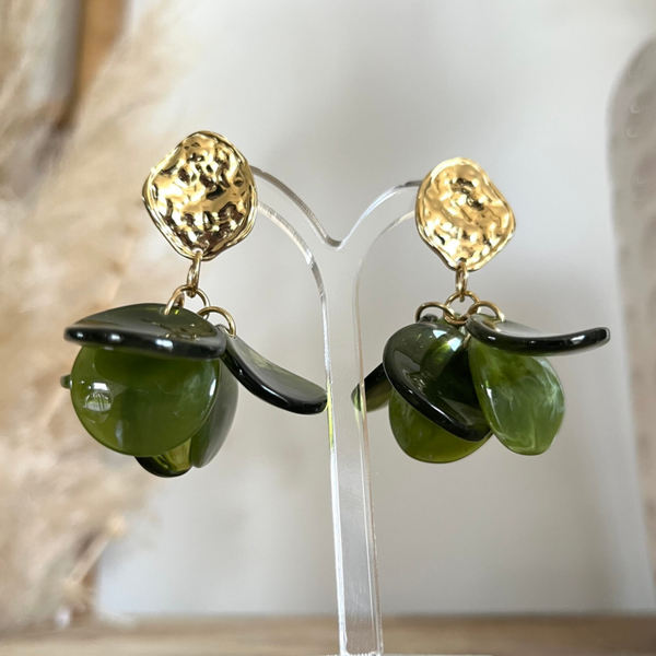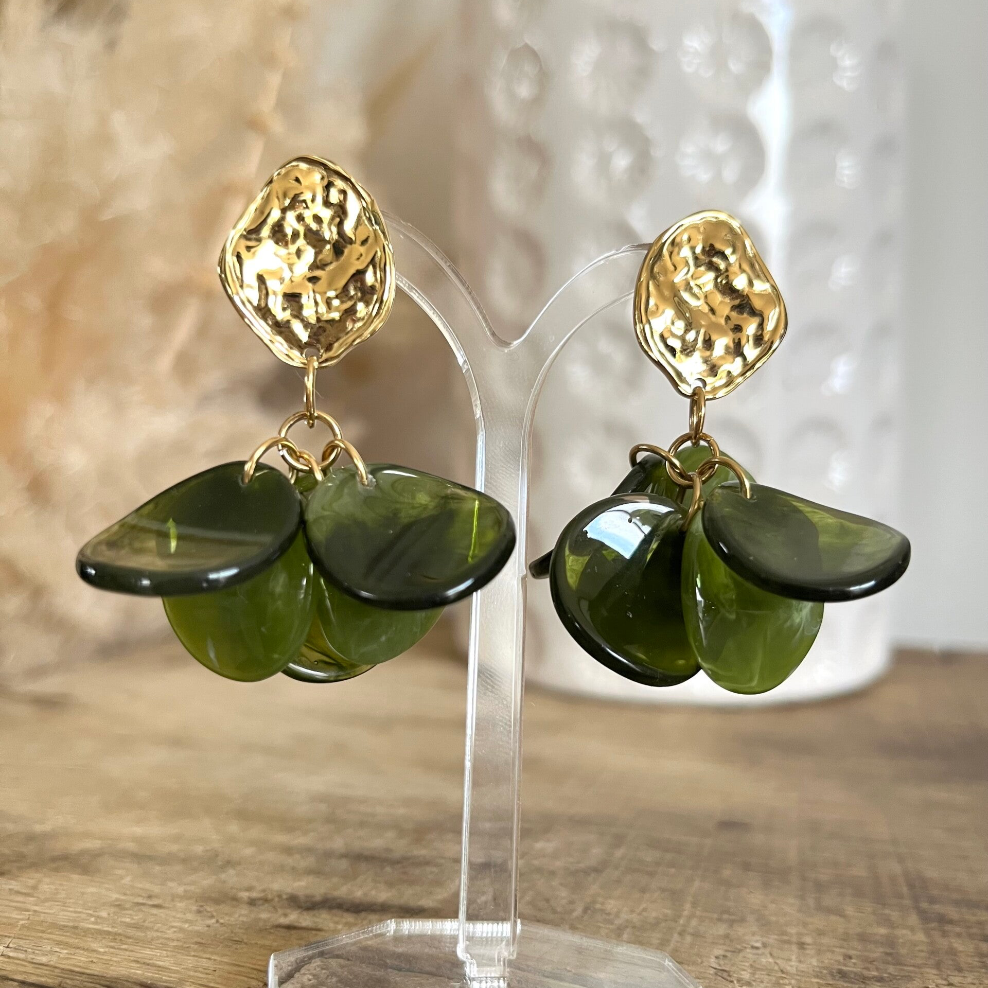 - Boucles d'oreilles pendantes en acier inoxydable composées d'une pièce texturée et de pièces pendantes en acétate.