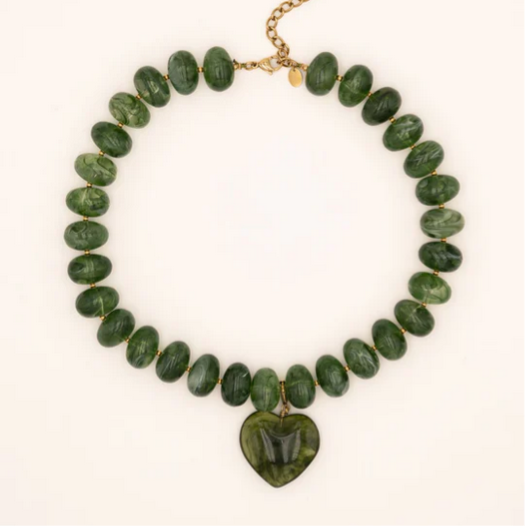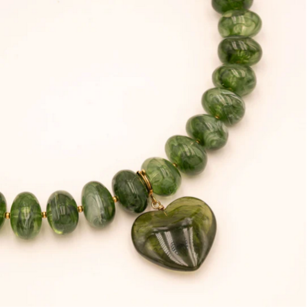 • Collier sur cordon composé de grosses perles en résine colorée et d'un pendentif amovible en forme de coeur en résine.