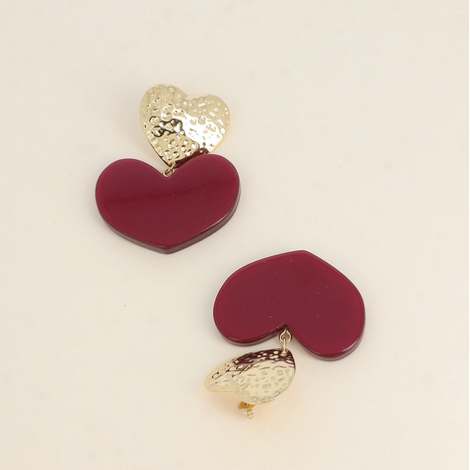 - Boucles d'oreilles pendantes en acier inoxydable composées d'un coeur texturé et d'un coeur pendant en résine colorée.