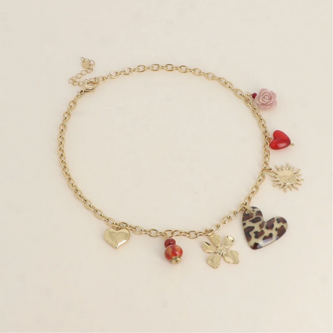 - Collier sur chaîne en acier inoxydable composé de divers pendentifs (perles en céramique, coeurs léopard, texturé, en résine, soleil et fleur).