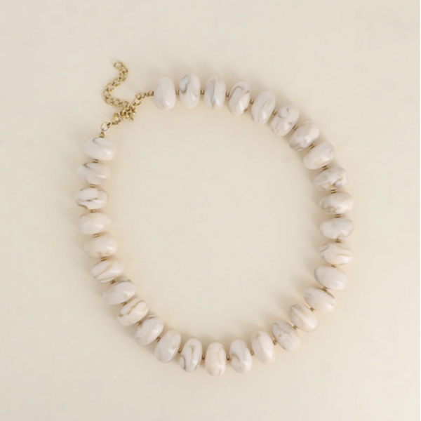 - Collier sur câble composé de perles ovales en résine et en acier inoxydable.