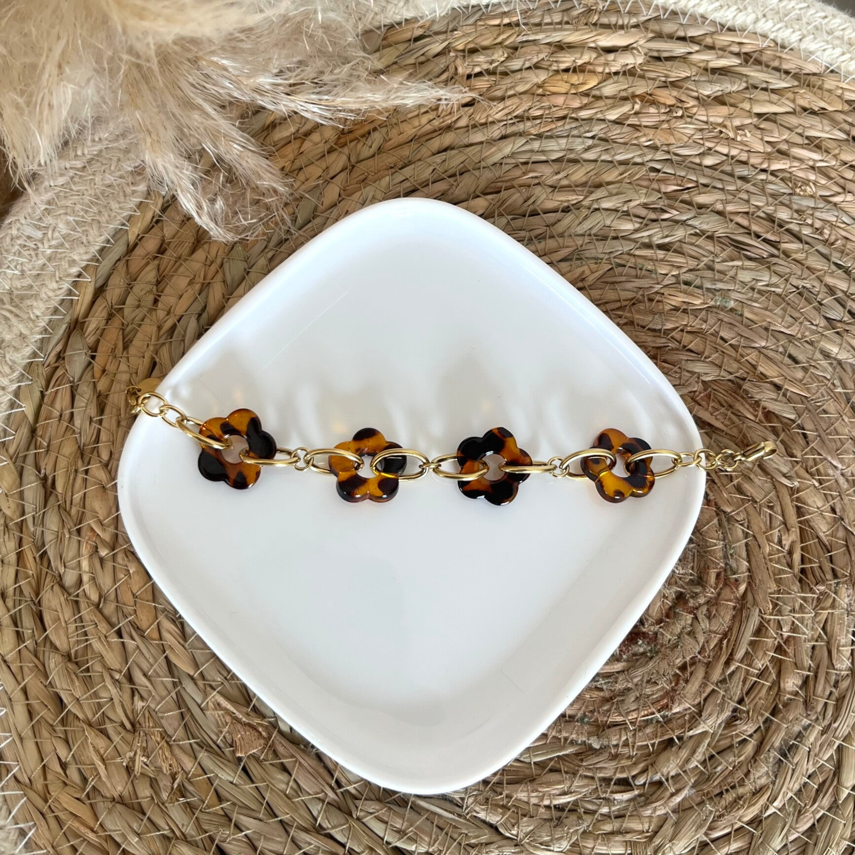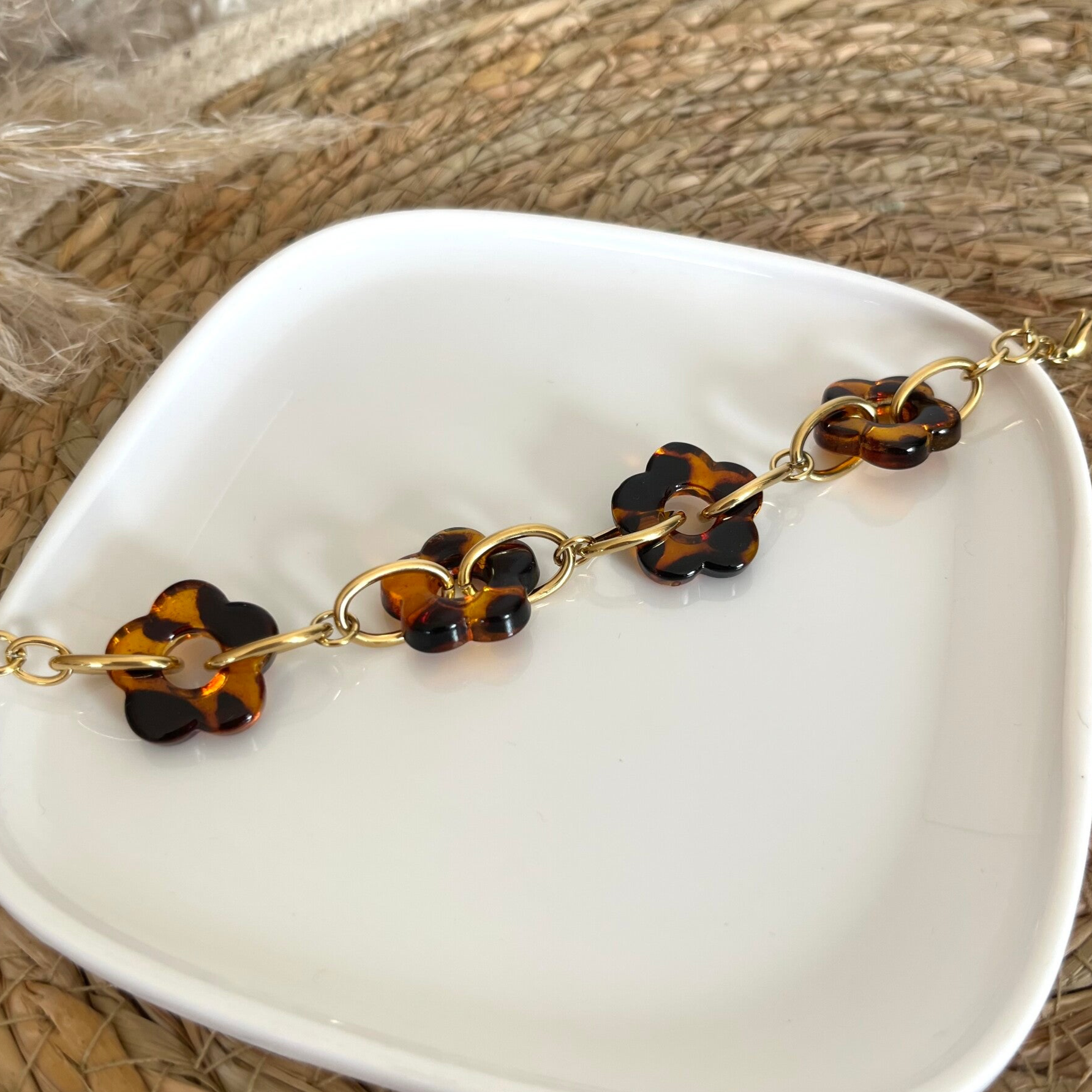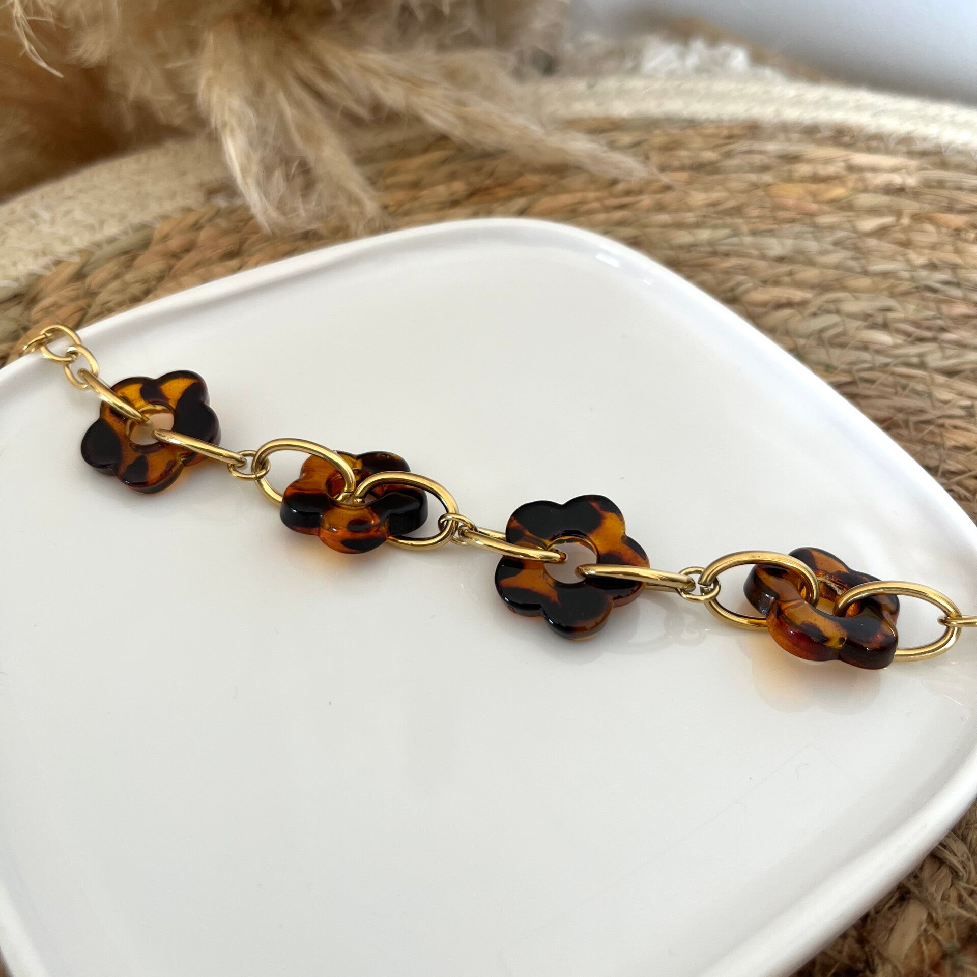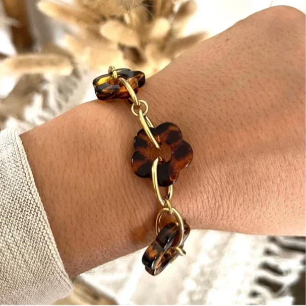 - Bracelet sur chaîne en acier inoxydable composé de fleurs en résine et de maillons ovales.