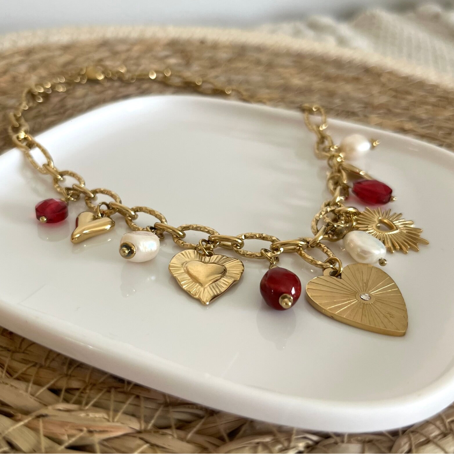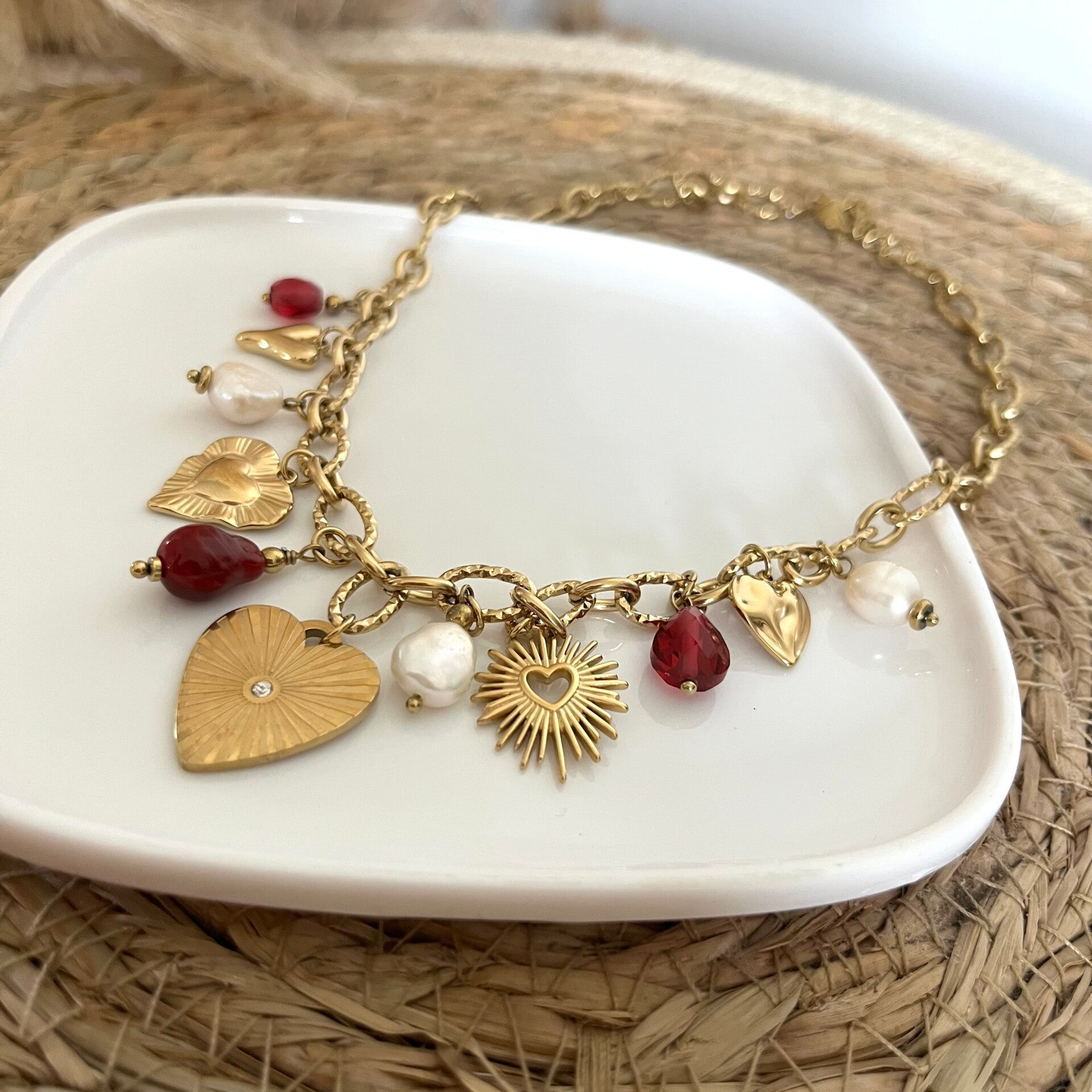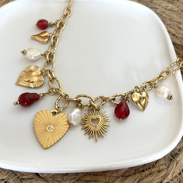 - Collier sur chaîne en acier inoxydable composé de breloques coeurs, de perles et de perles d'eau douce.