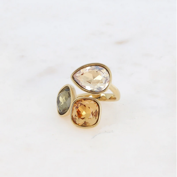 • Bague ouverte en acier inoxydable composée de trois cristaux taillés : 2 carrés et 1 goutte.