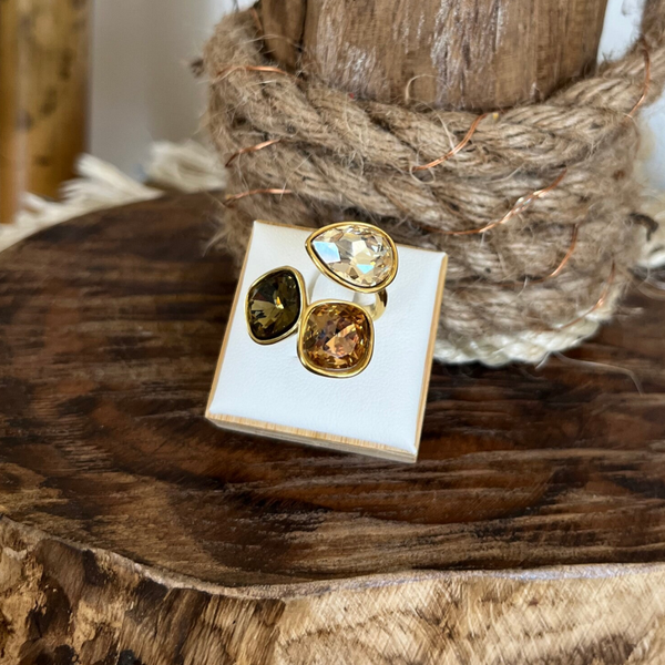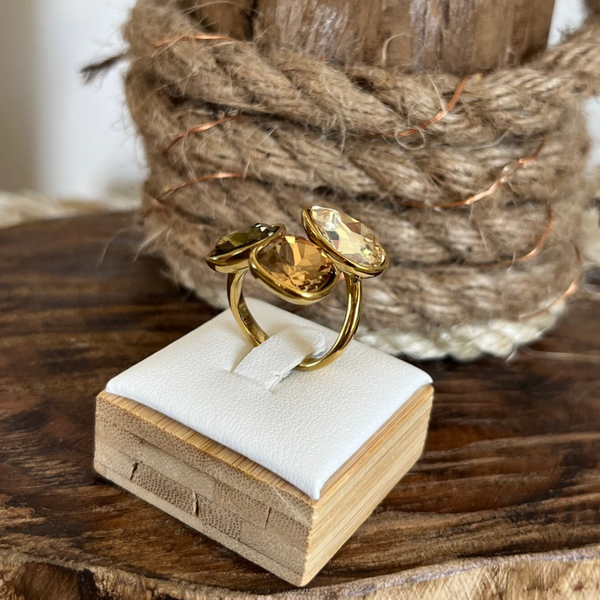 - Bague ouverte en acier inoxydable composée de trois cristaux taillés : 2 carrés et 1 goutte.