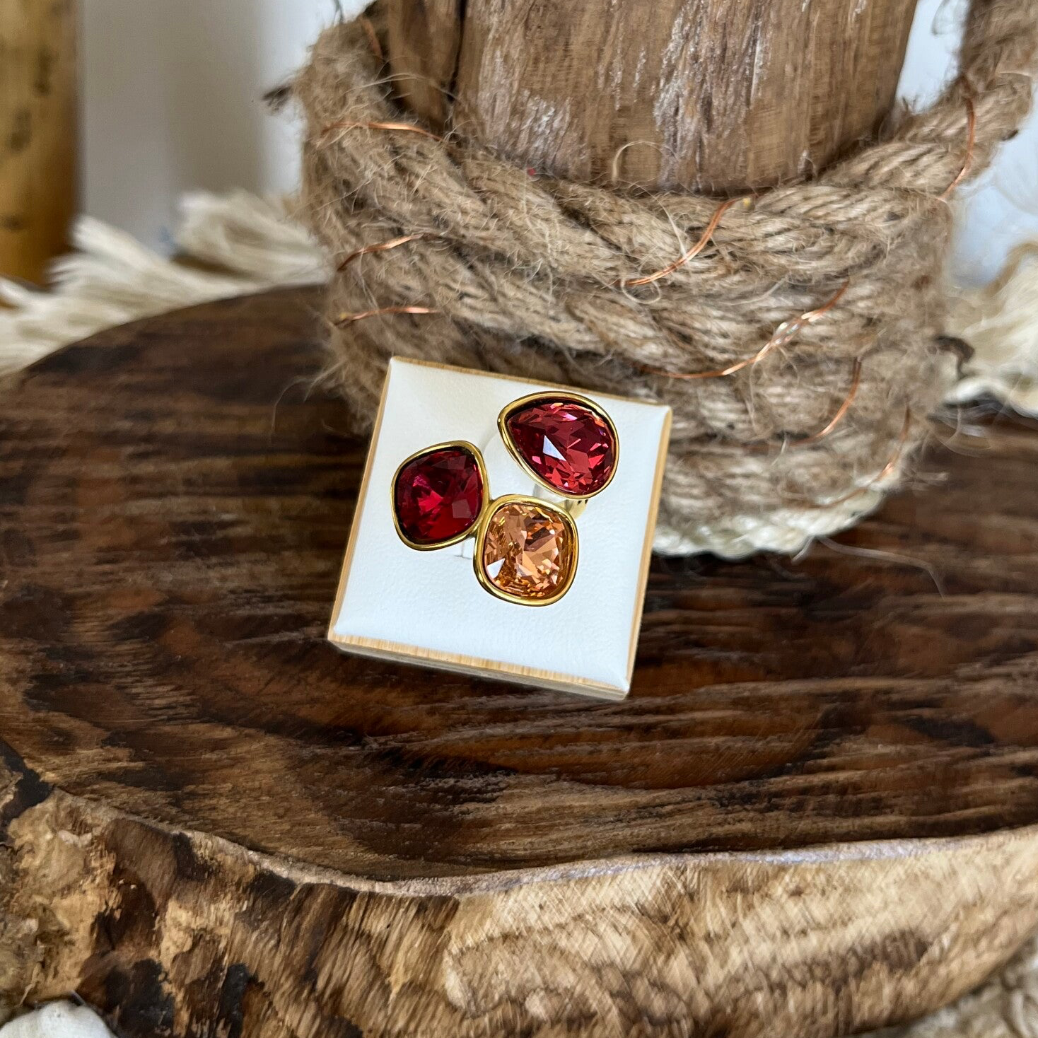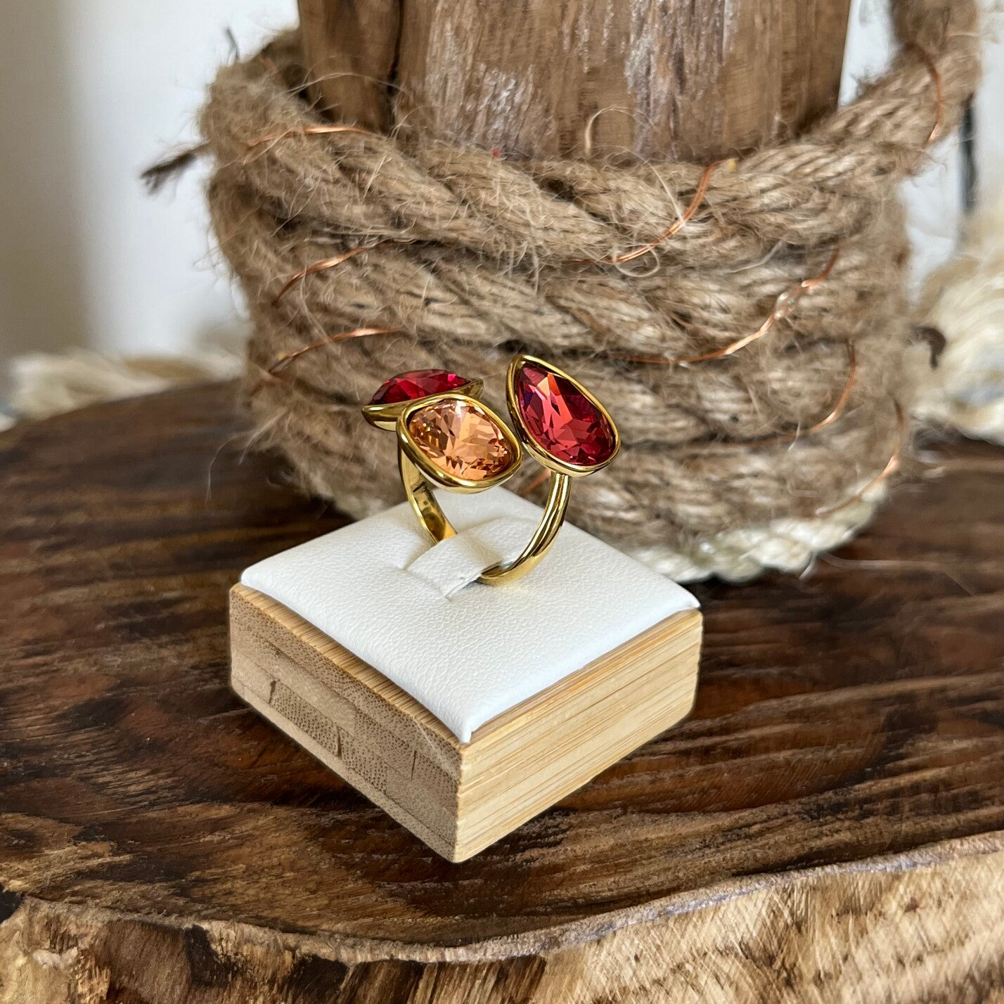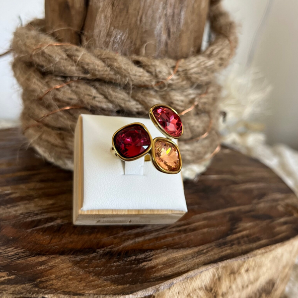 - Bague ouverte en acier inoxydable composée de trois cristaux taillés : 2 carrés et 1 goutte.