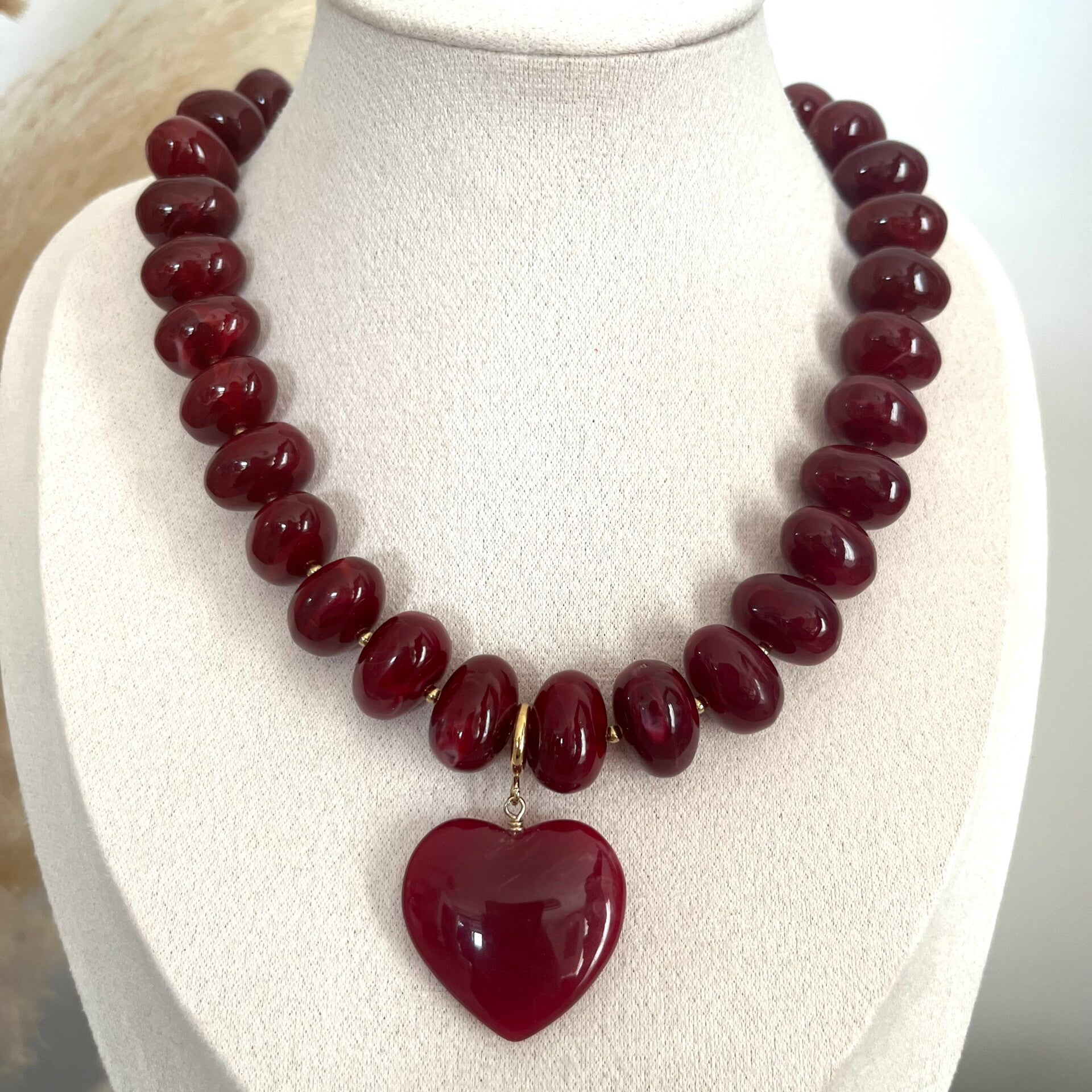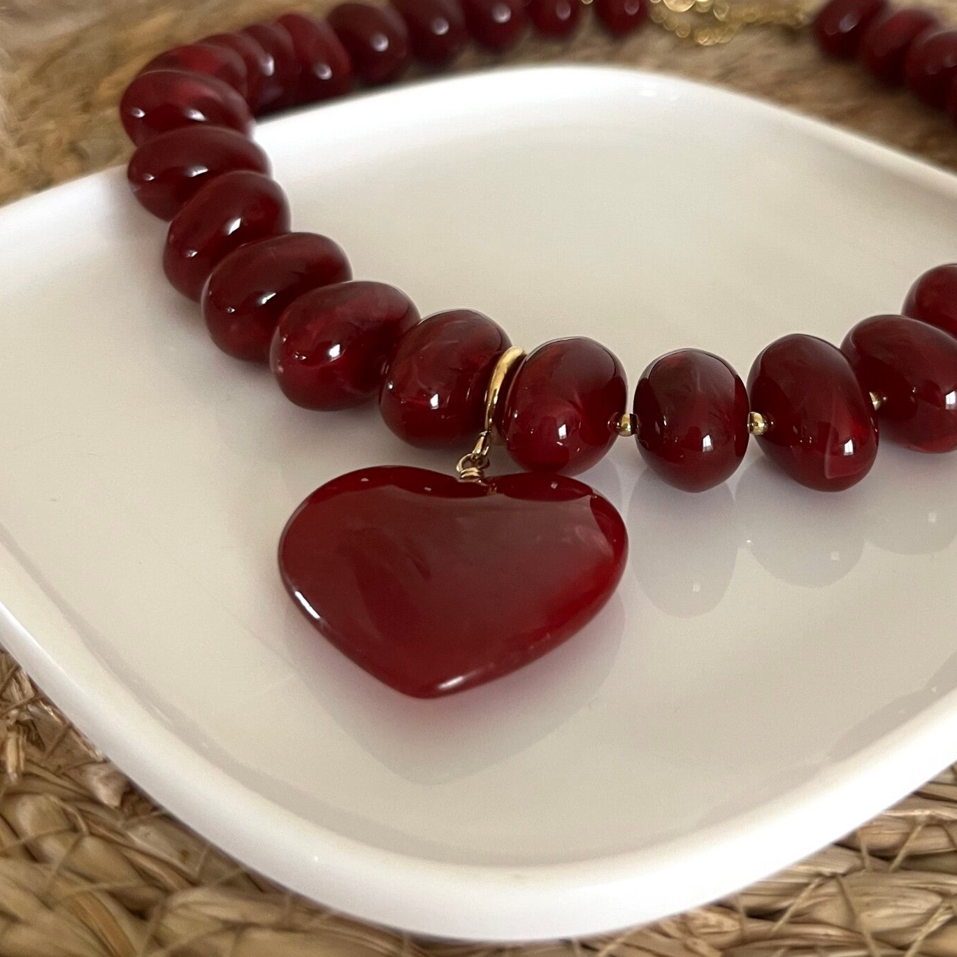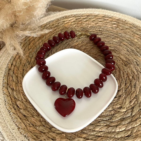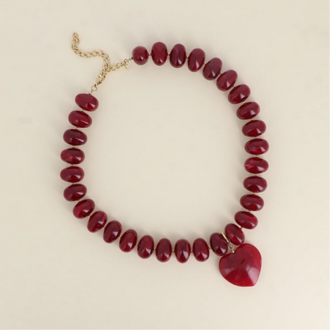 - Collier sur cordon composé de grosses perles en résine colorée et d'un pendentif amovible en forme de coeur en résine.
