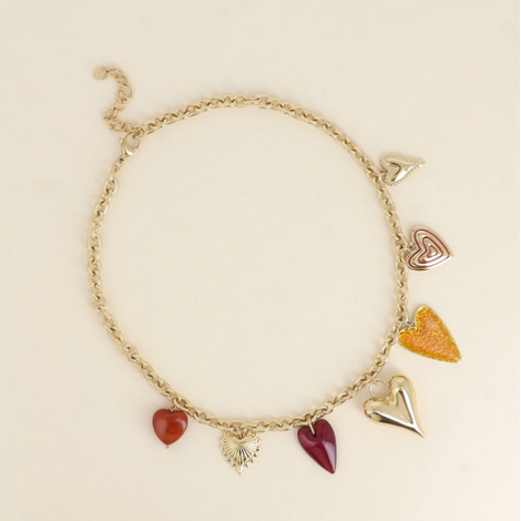 - Collier sur chaîne en acier inoxydable composé de breloques coeurs en résine, émail.