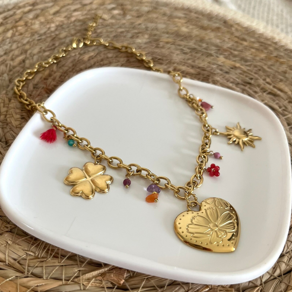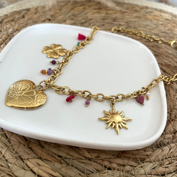 - Collier sur chaîne en acier inoxydable composé de divers pendentifs (pierres naturelles, soleil, coeur avec fleur gravée et trèfle).