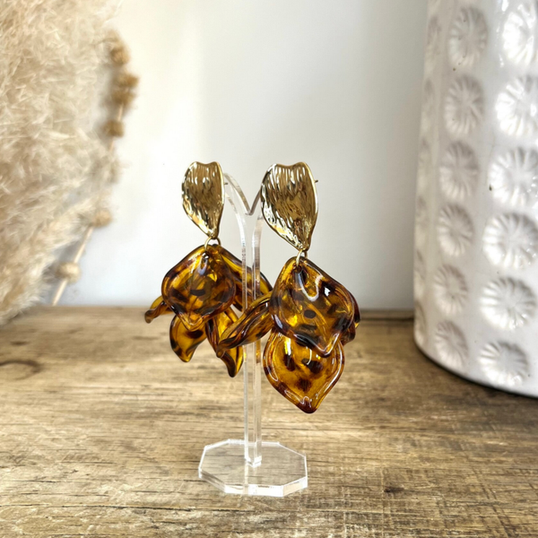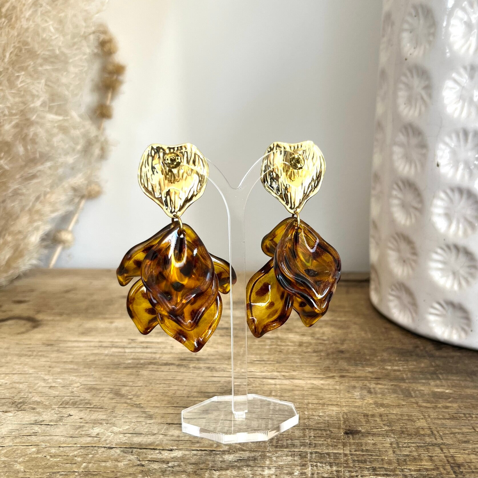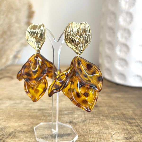 - Boucles d'oreilles pendantes en acier inoxydable composées d'une pièce texturé et de pièces pendantes en acétate.