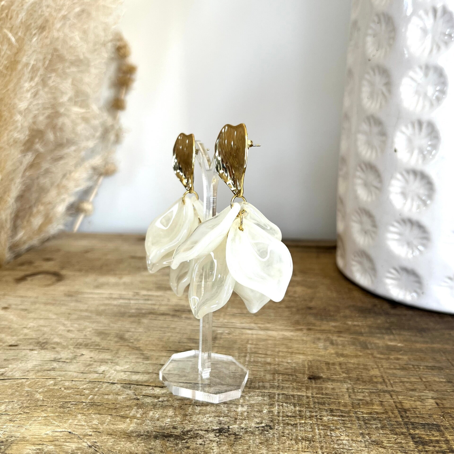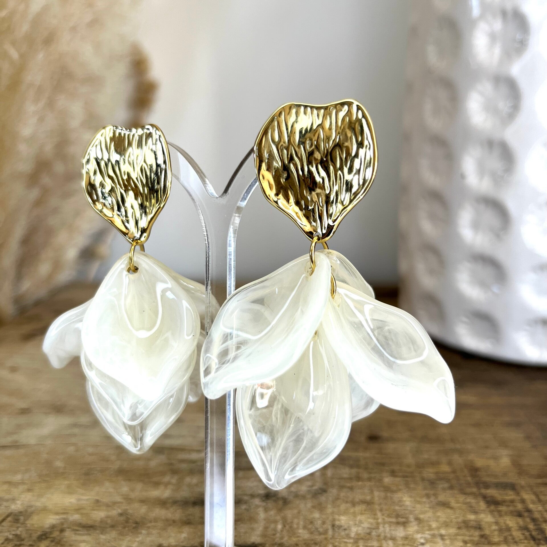 • Boucles d'oreilles pendantes en acier inoxydable composées d'une pièce texturé et de pièces pendantes en acétate.
