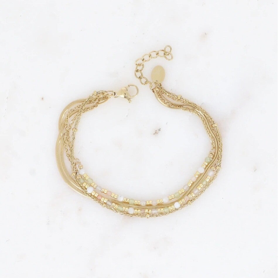 - Bracelet multi rangs en acier inoxydable composé de 5 chaînes dont 2 mailles miroir, 2 mailles forçat avec des pierres naturelles (Peridot) et une chaîne torsadée avec des boules perlées.