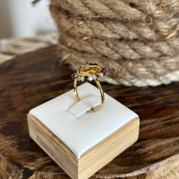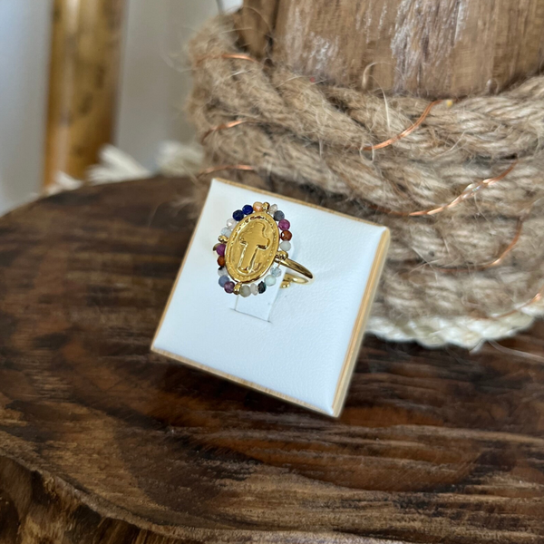 - Bague fine en acier inoxydable composée d'un médaillon avec une croix latine embellie par de petites pierres naturelles (tourmaline)