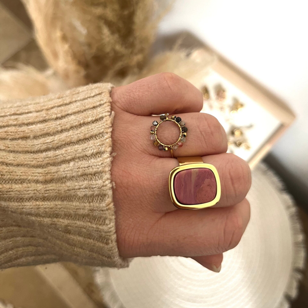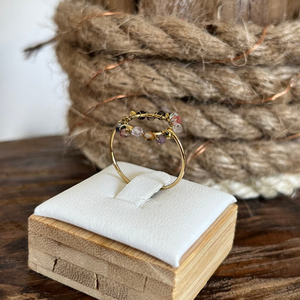 - Bague fine en acier inoxydable composée d'un anneau en forme de cercle, serti de perles en acier inoxydable et de petites pierres naturelles (tourmaline).