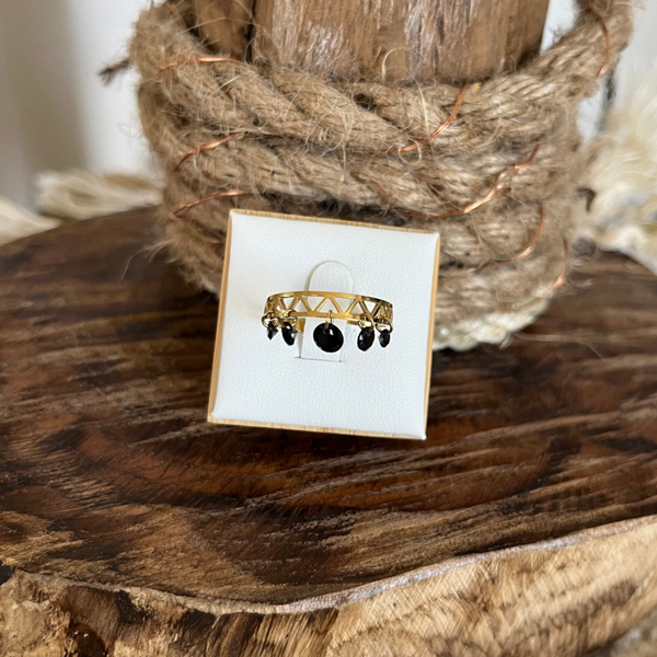 - Bague en acier inoxydable composée d'un anneau avec un motif en zigzag, embelli par 5 petits cristaux pendants.