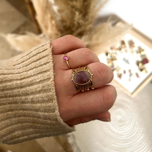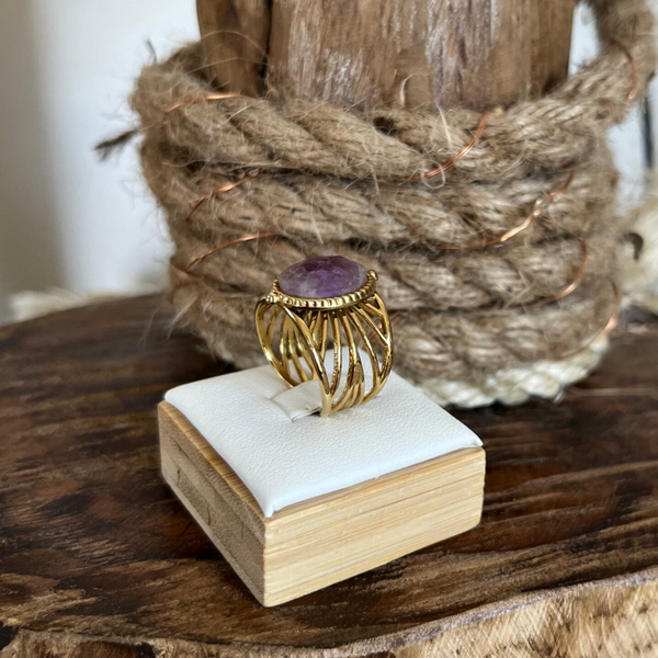 - Bague en acier inoxydable composée d'une pierre naturelle ovale sur un anneau ajouré.