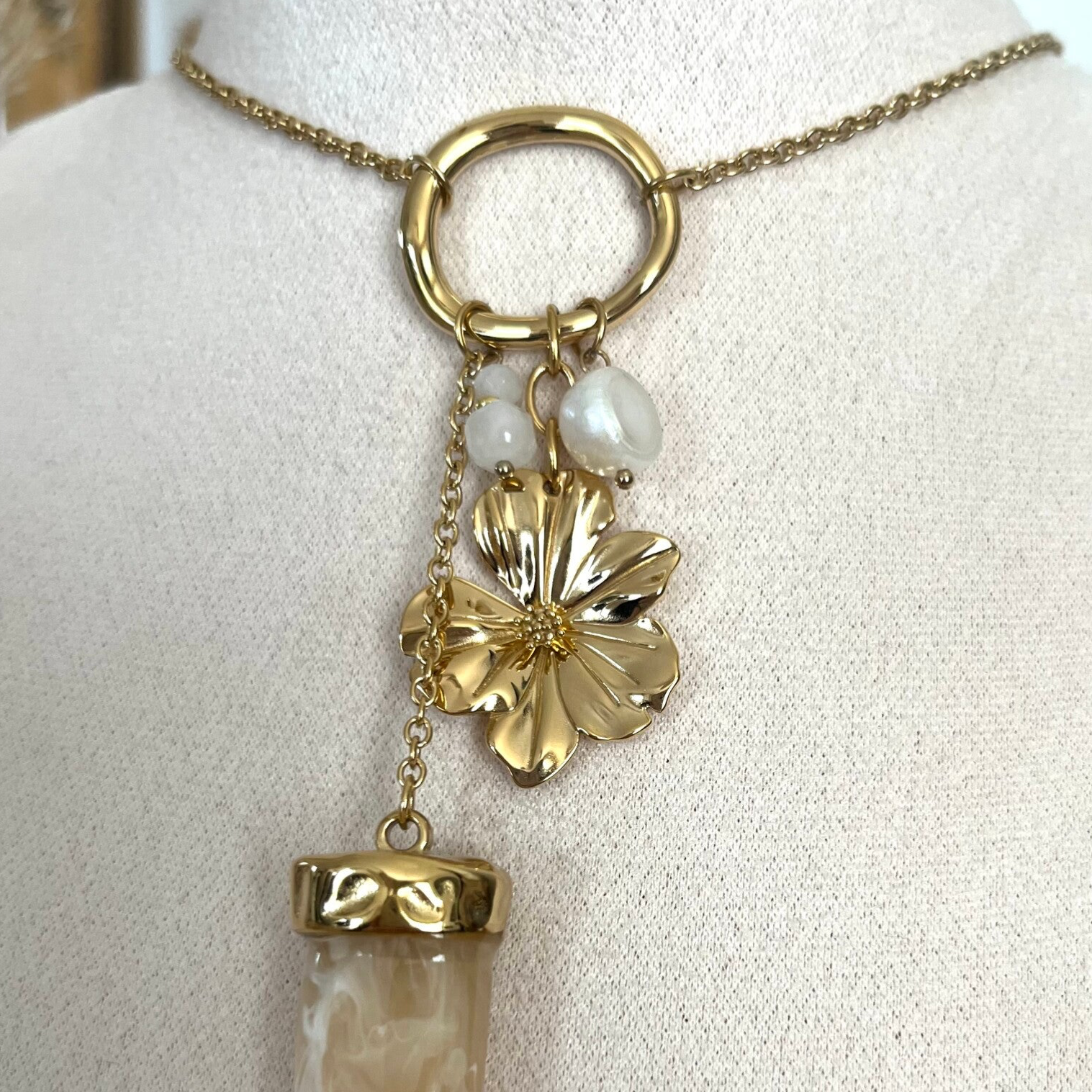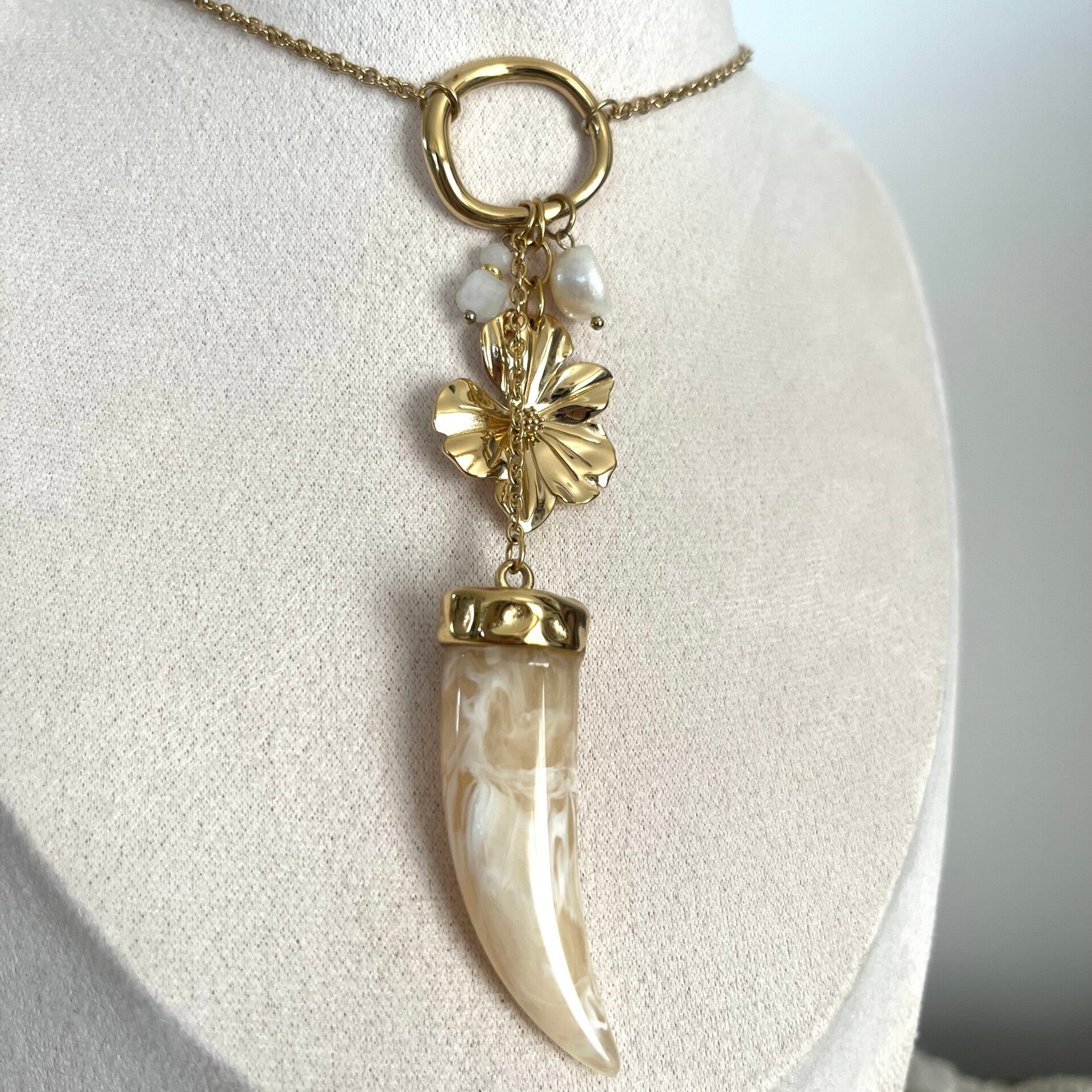 - Collier type sautoir sur chaîne en acier inoxydable composé de divers pendentifs (anneau, fleur, perles et corne en résine)