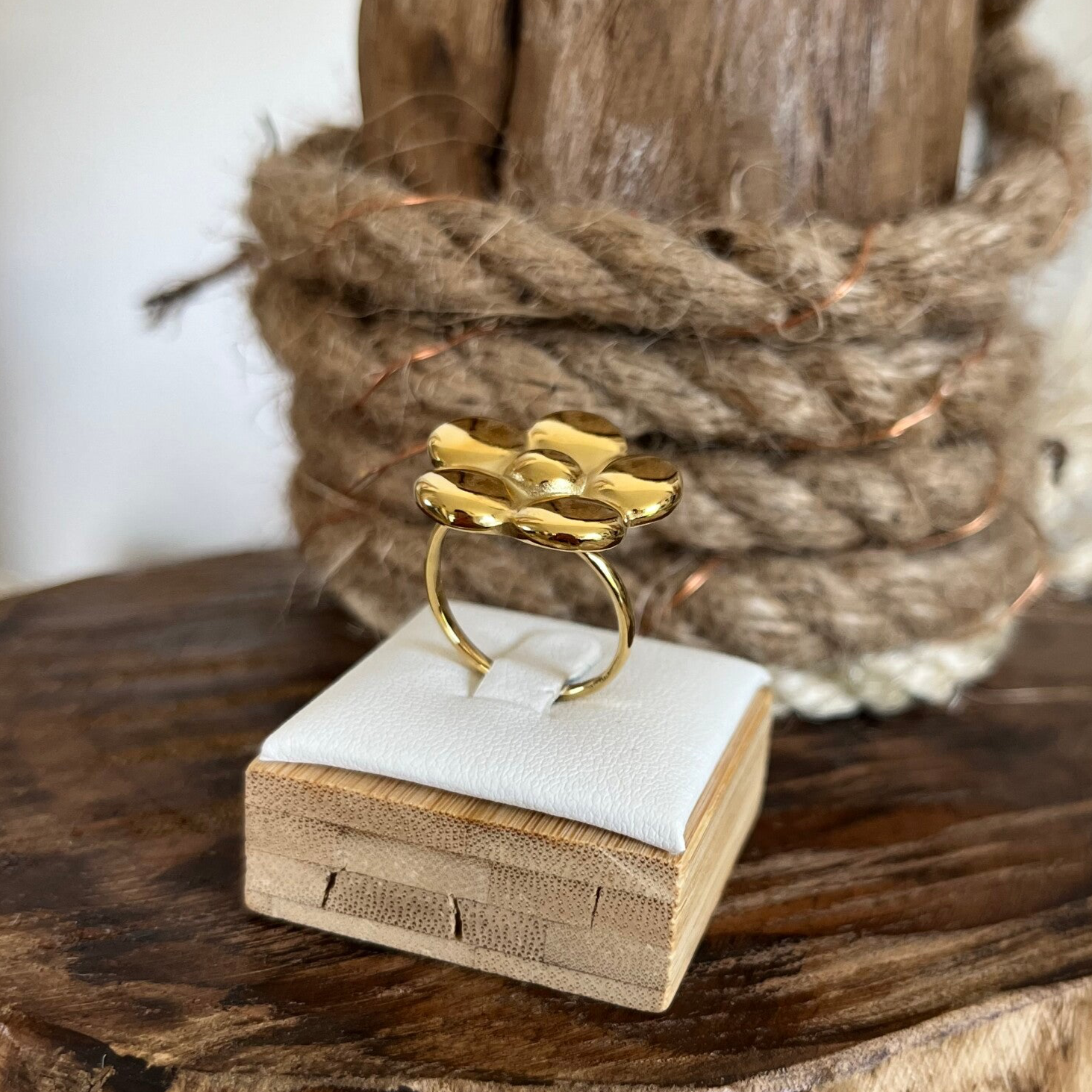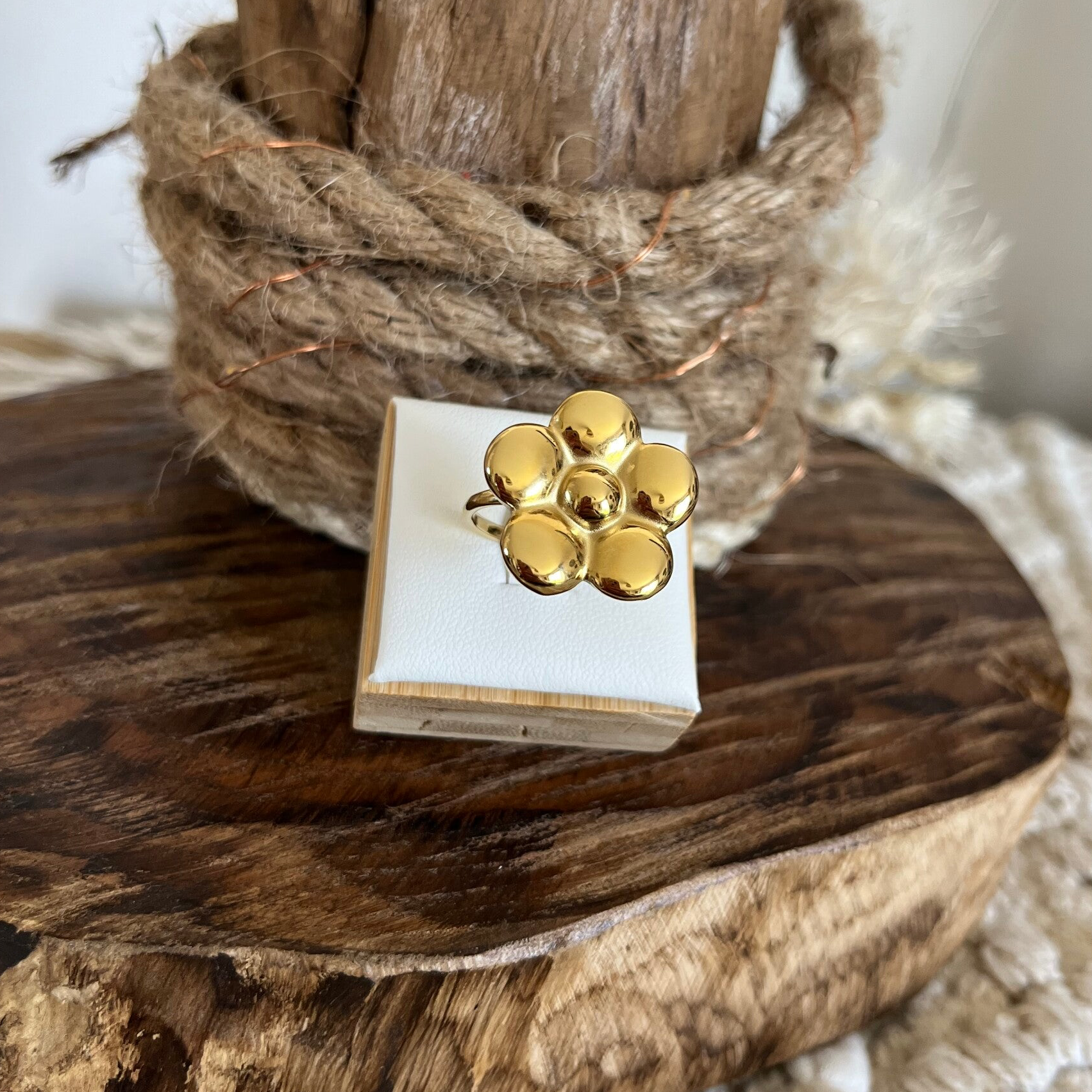 - Bague en acier inoxydable composée d'une fleur en émail coloré.